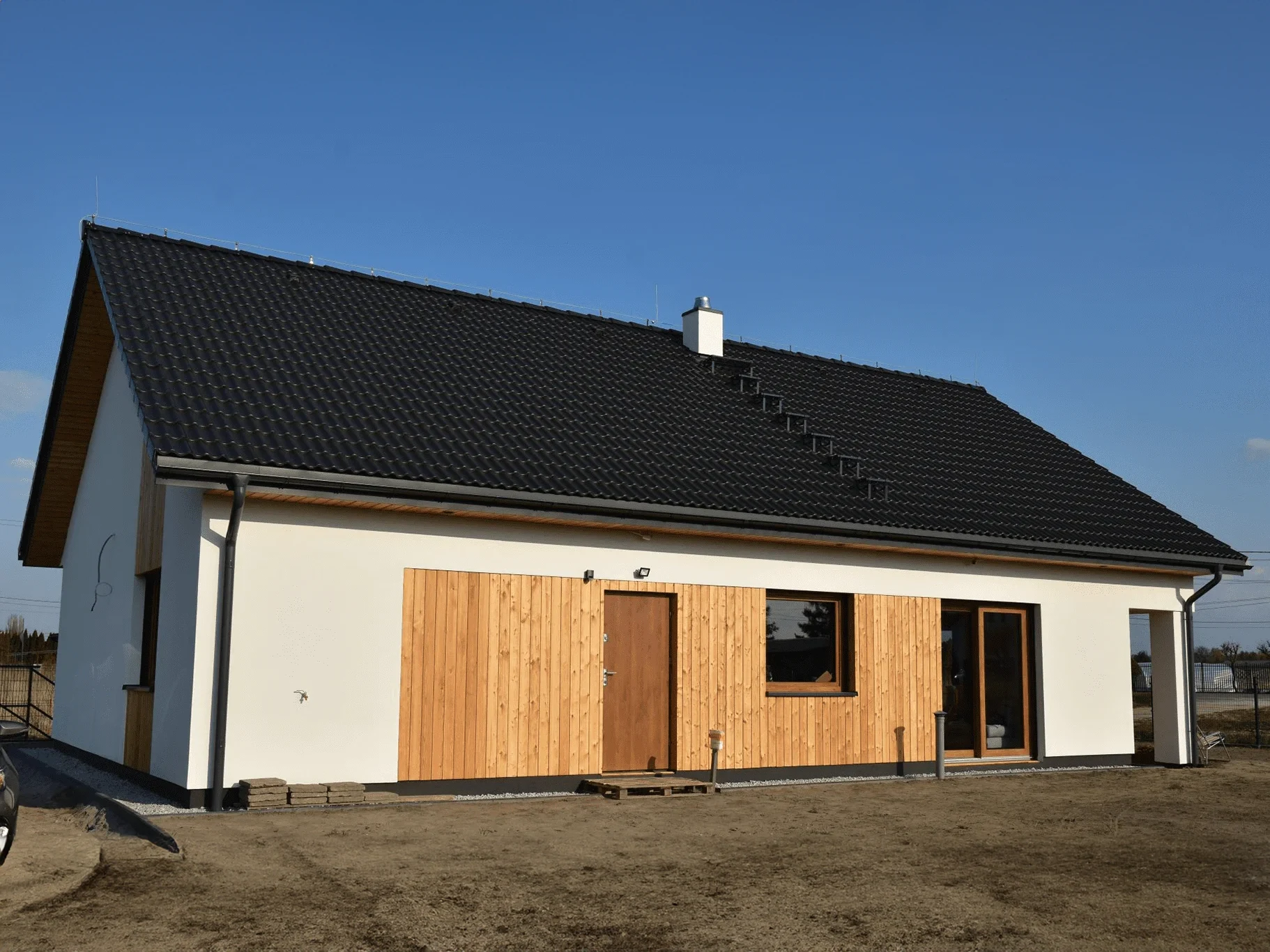 - Zamknięta konstrukcja domu z pokryciem dachowym (dach pokryty blachodachówką wraz z membraną dachową)