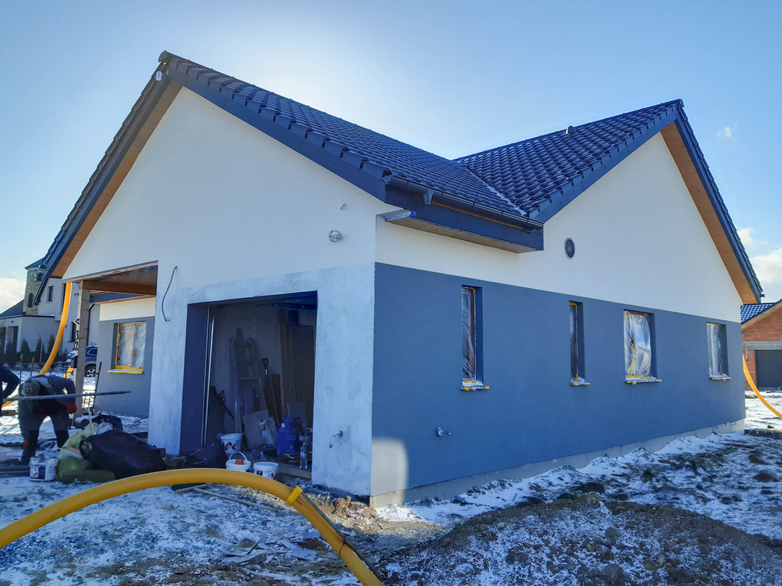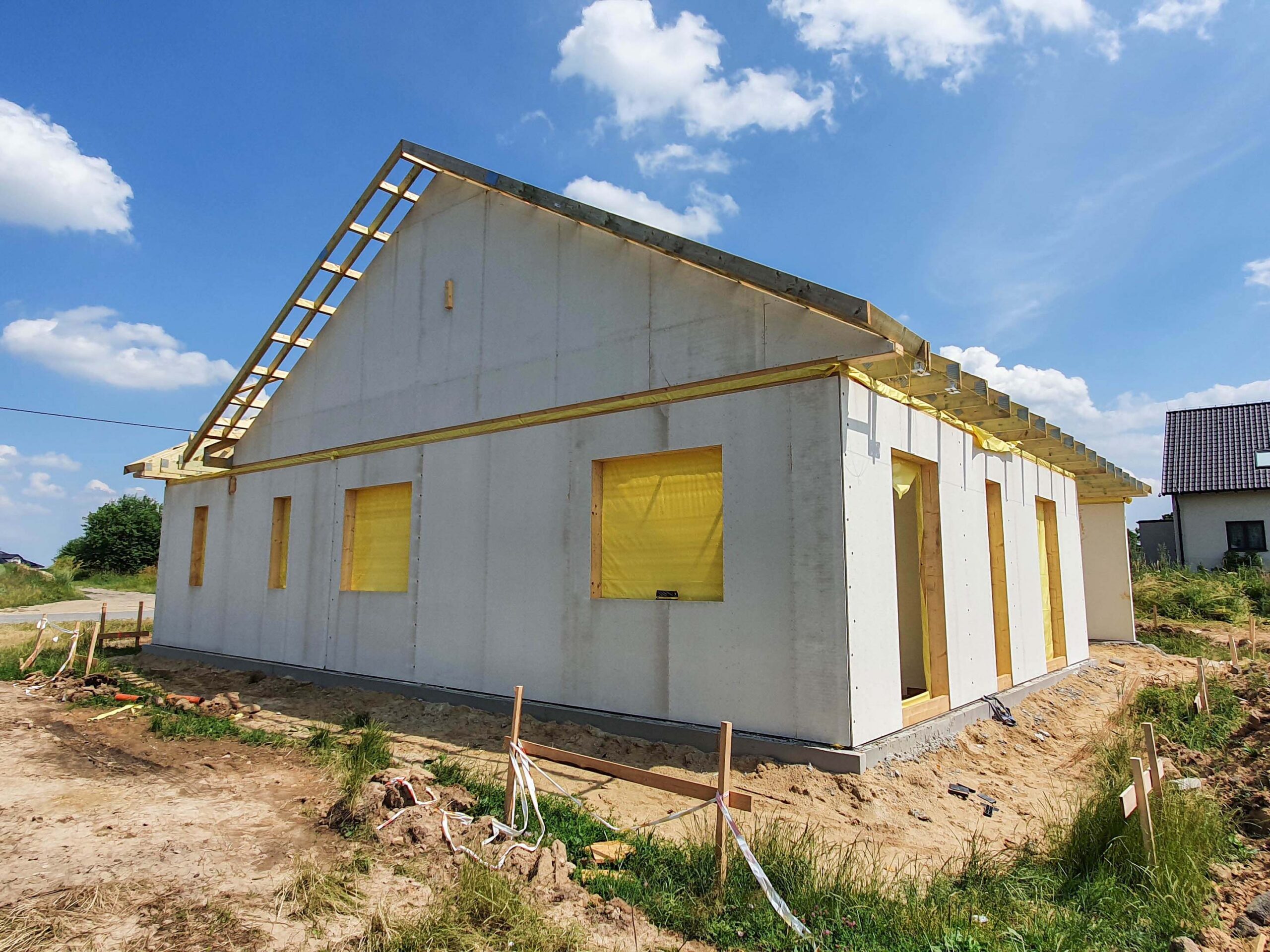 • Zamknięta konstrukcja domu z pokryciem dachowym (dach pokryty blachodachówką wraz z membraną dachową)