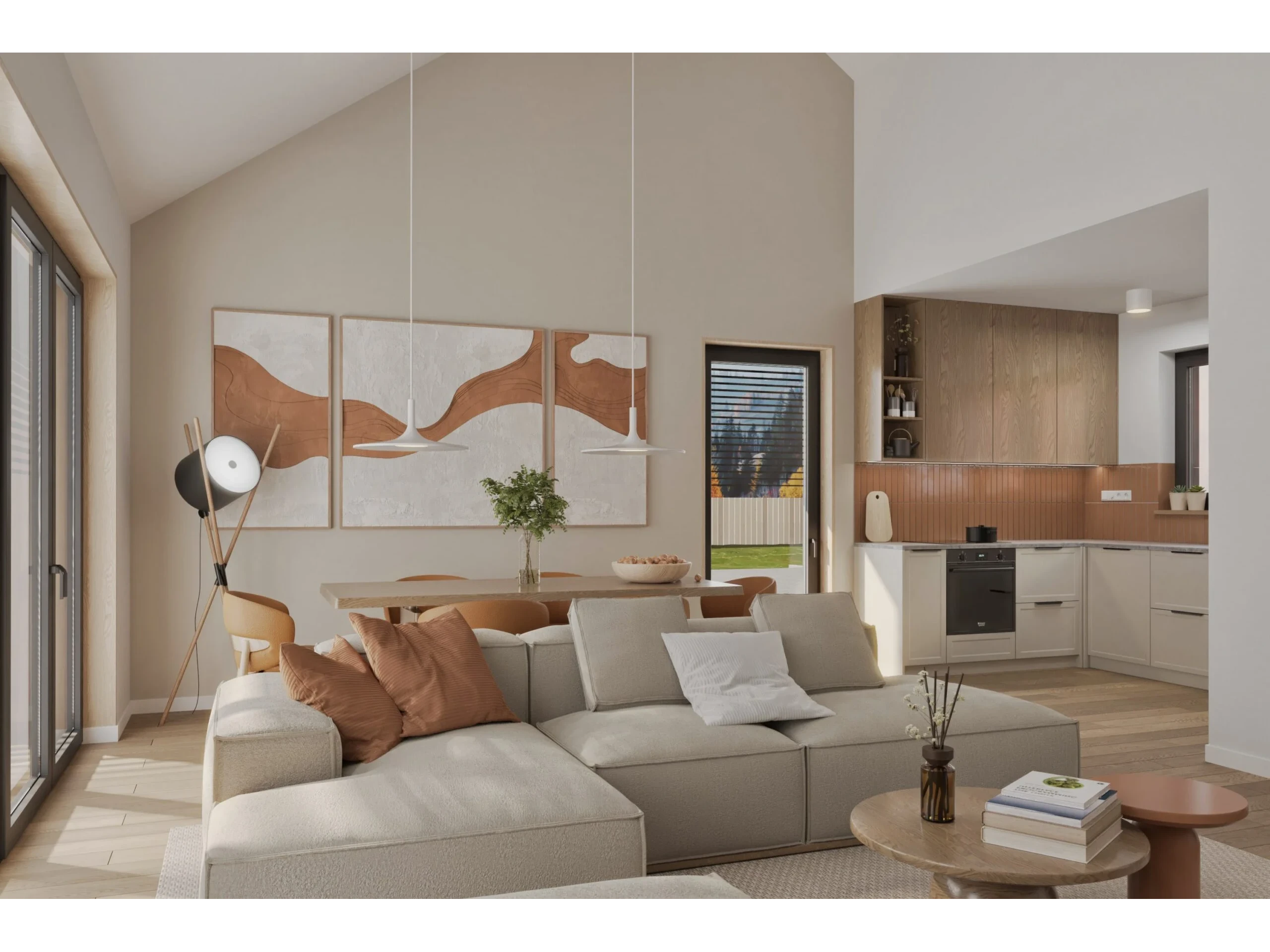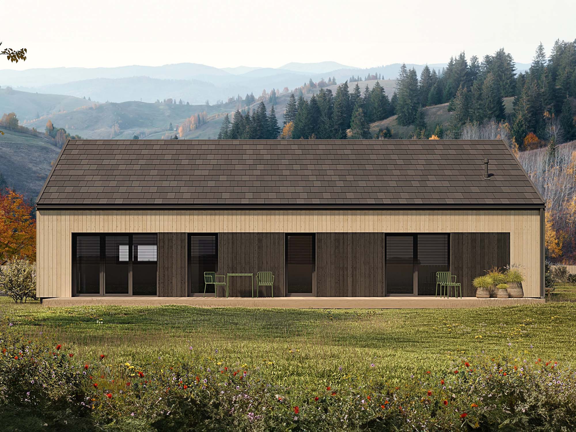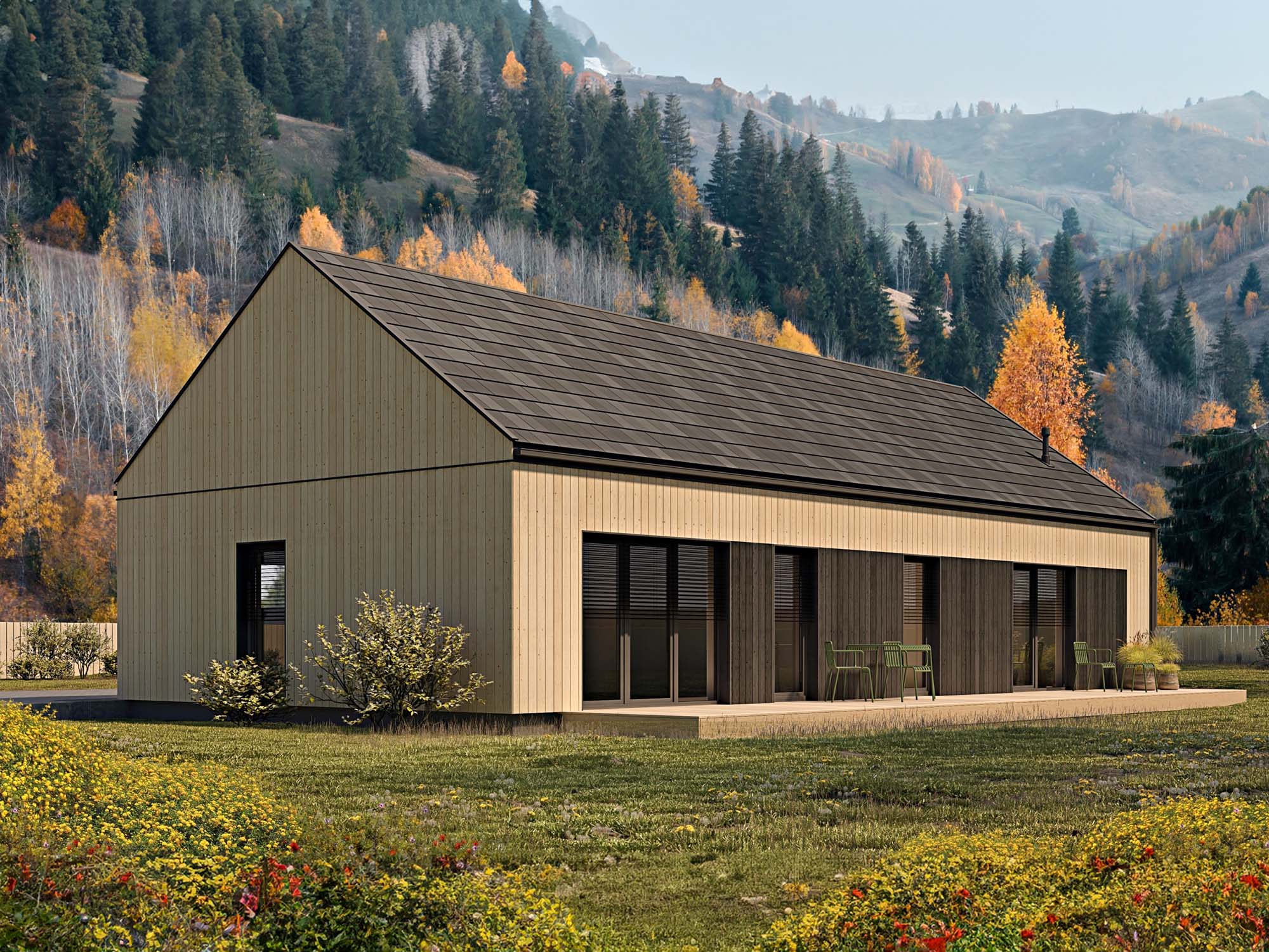 Grand House 103 to parterowy dom z tarasem w stylu nowoczesnej stodoły zaprojektowany z myślą o 4-osobowej rodzinie. W skład pomieszczeń wchodzi duży salon z aneksem kuchennym o powierzchni 37 m², 3 ustawne pokoje, 2 przestronne łazienki, pomieszczenie gospodarcze oraz wiatrołap.