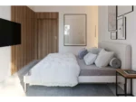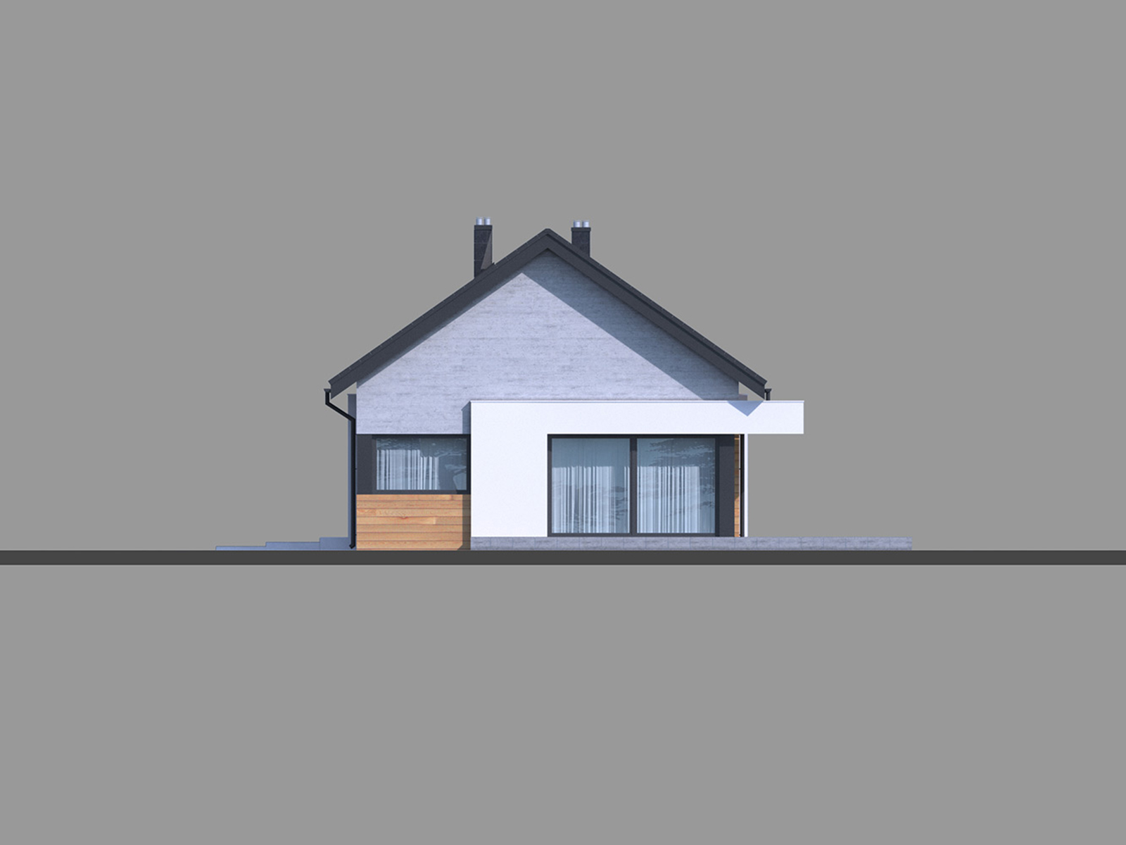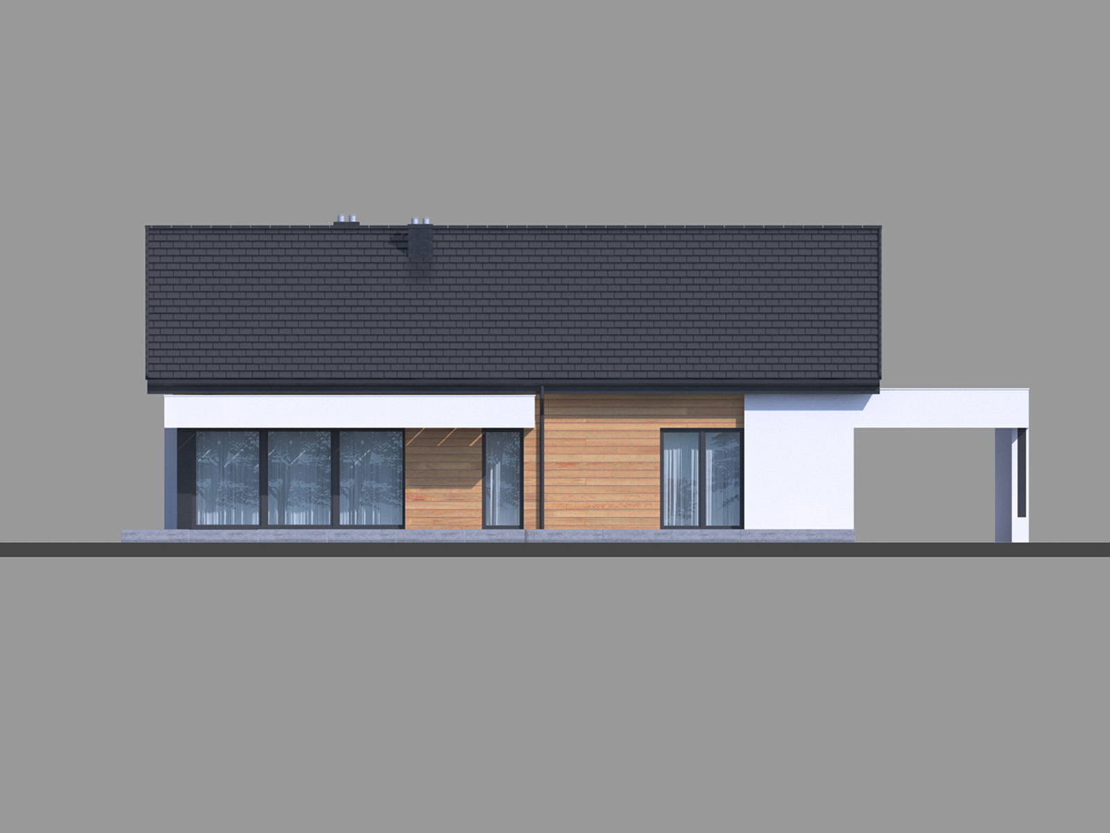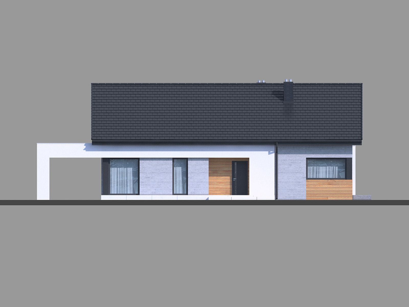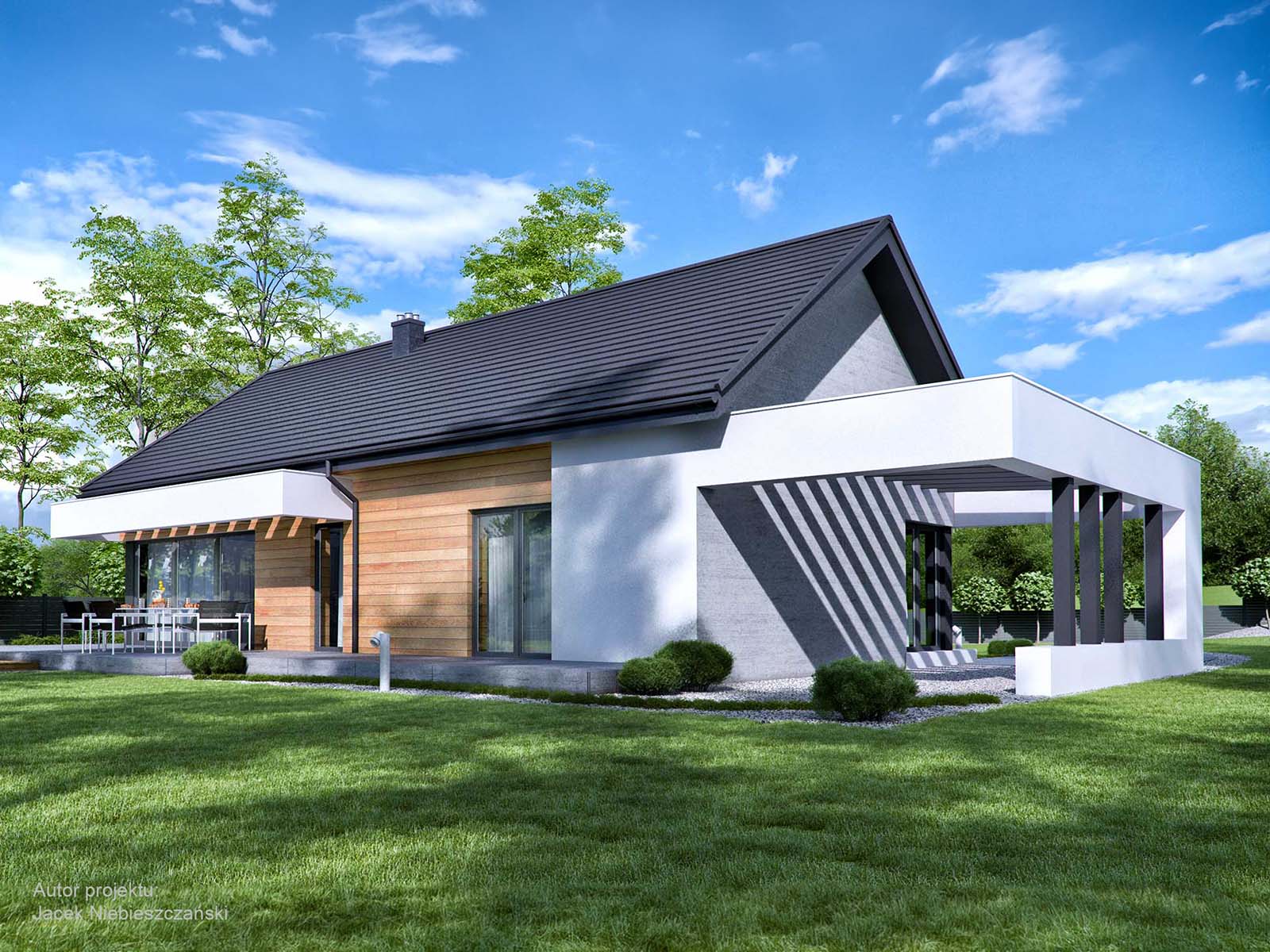 Dom HOMEKONCEPT 45 to interesująca propozycja dla osób szukających nowoczesnego domu parterowego o prostej bryle oraz bardzo komfortowym i przemyślanym układzie funkcjonalnym. Szczególną uwagę zwraca ozdobne belkowanie przylegające do budynku, które może pełnić rolę niezadaszonej wiaty na samochód osobowy. Na elewacji ogrodowej zaprojektowano również ażurową osłonę tarasu, chroniącą przed nadmiernym nasłonecznieniem. Elewacja domu skomponowana z tynku oraz naturalnego drewna, doskonale komponuje się z szarą, płaską dachówką.