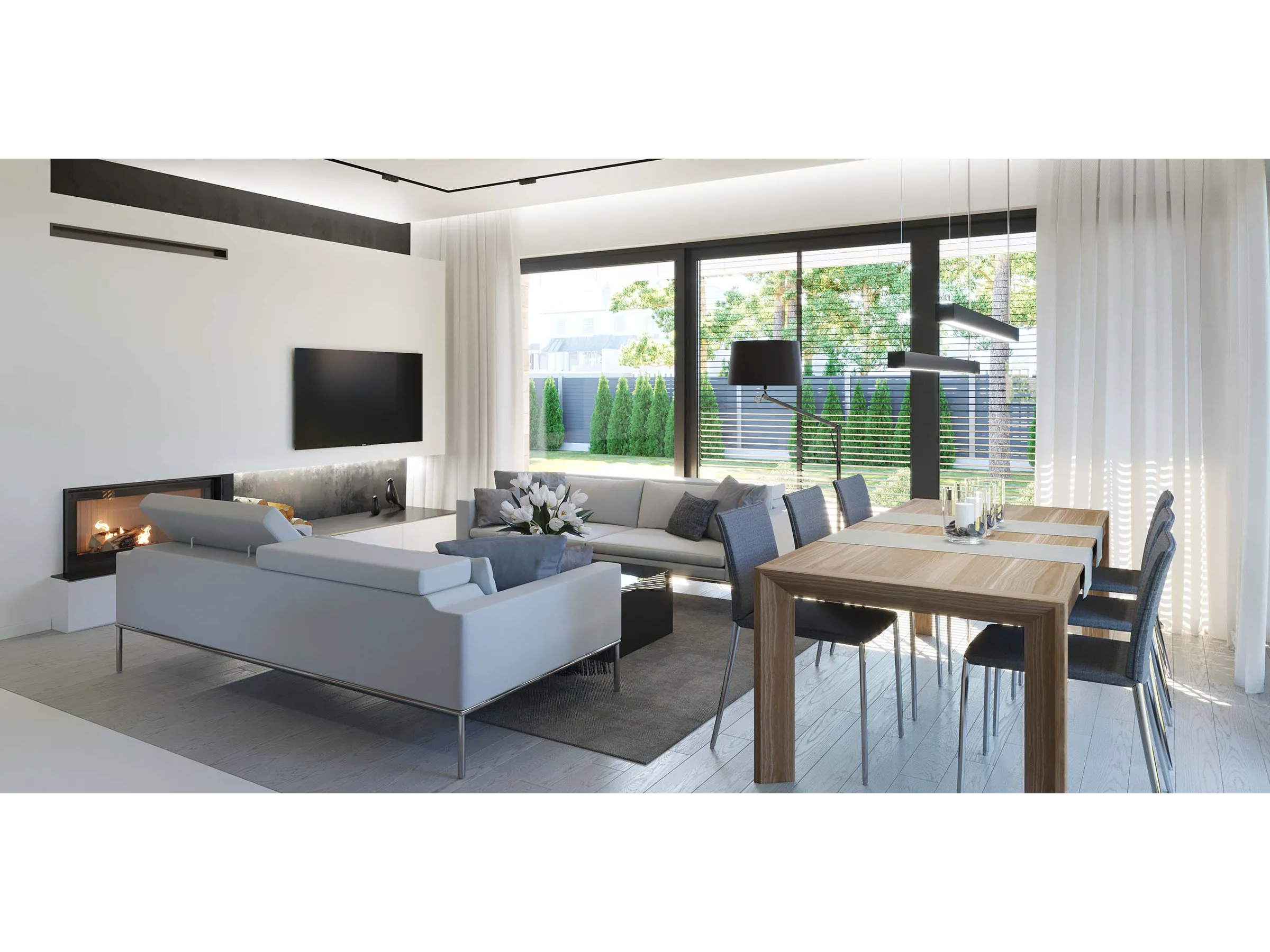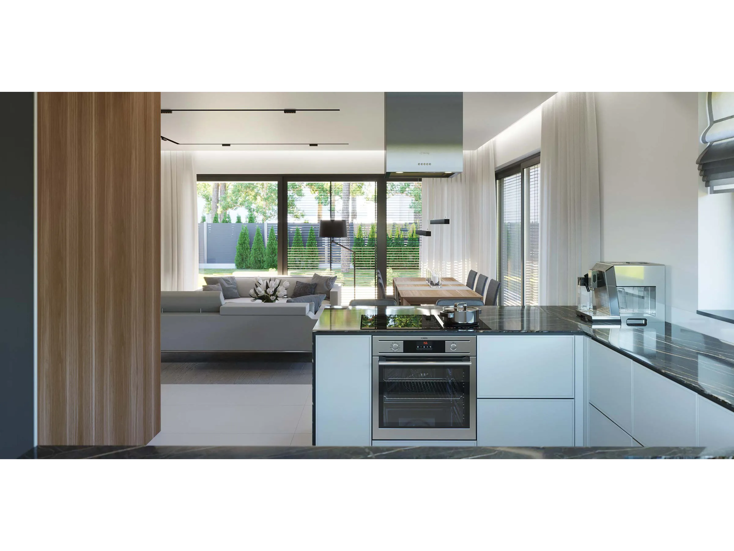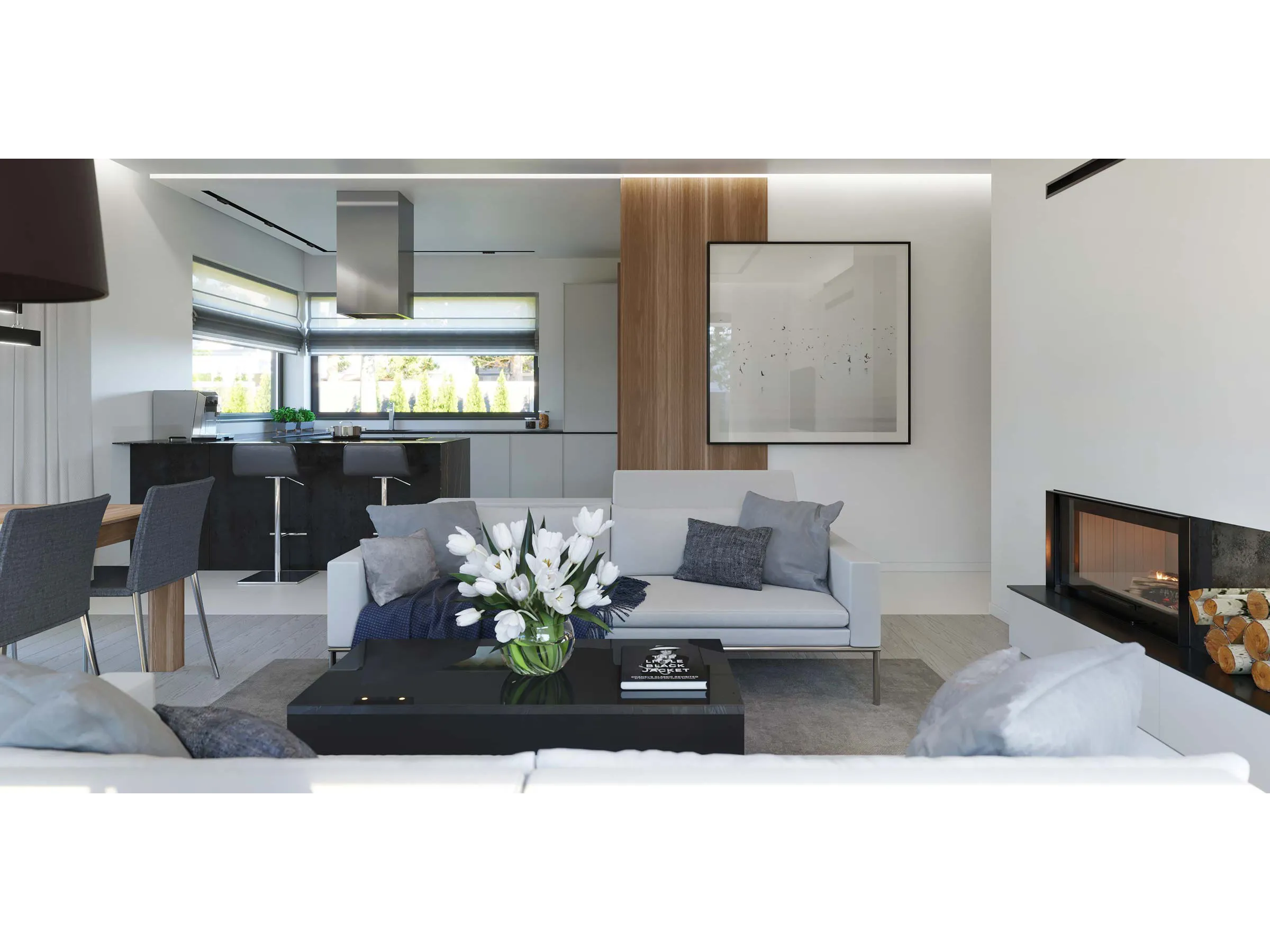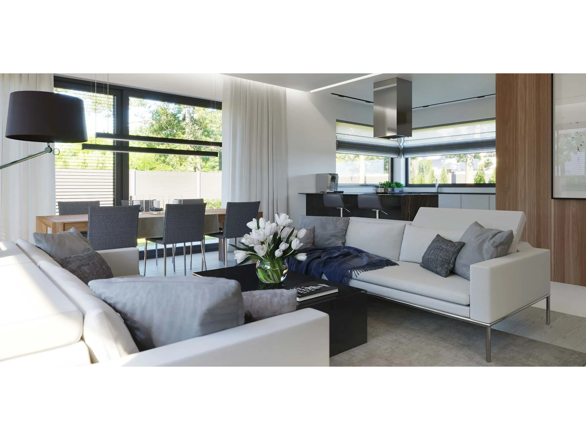 Piękny, słoneczny salon został zaprojektowany na planie kwadratu, dzięki czemu jest on bardzo ustawny i zapewnia wszystkim domownikom komfortową przestrzeń do życia. W centralnej części znajduje się kominek, który w czasie chłodniejszych dni z powodzeniem dogrzeje wszystkie pomieszczenia parteru. Częściowo zamknięta blatem roboczym kuchnia jest połączona z praktyczną spiżarnią. W części nocnej do dyspozycji mieszkańców są 4 bardzo wygodne pokoje, w tym sypialnia małżeńska z prywatną garderobą. Obok znajduje się duża łazienka z wanną i prysznicem oraz dodatkowa toaleta. Kotłownia z funkcją pralni jest dostępna bezpośrednio z wiatrołapu.