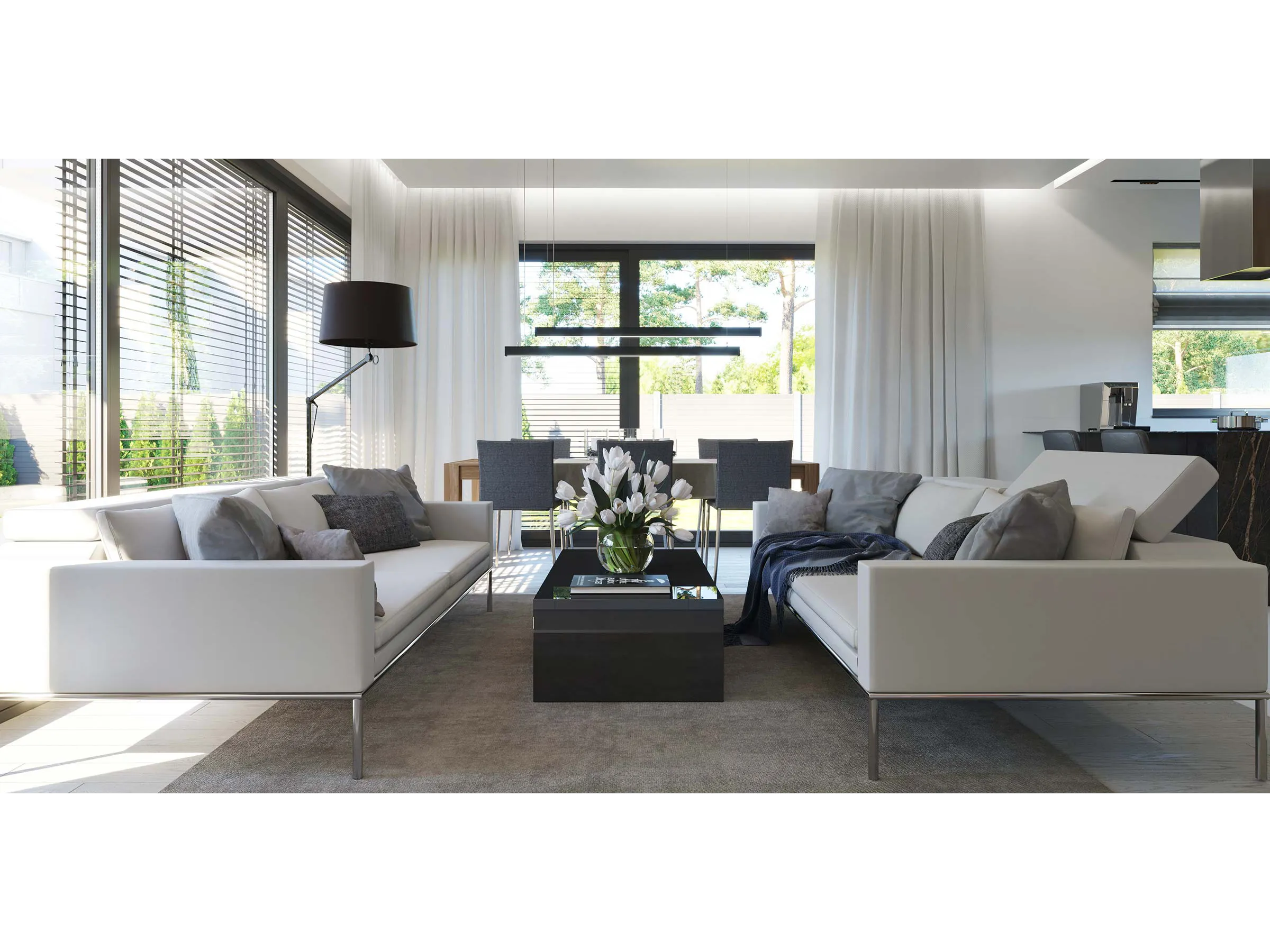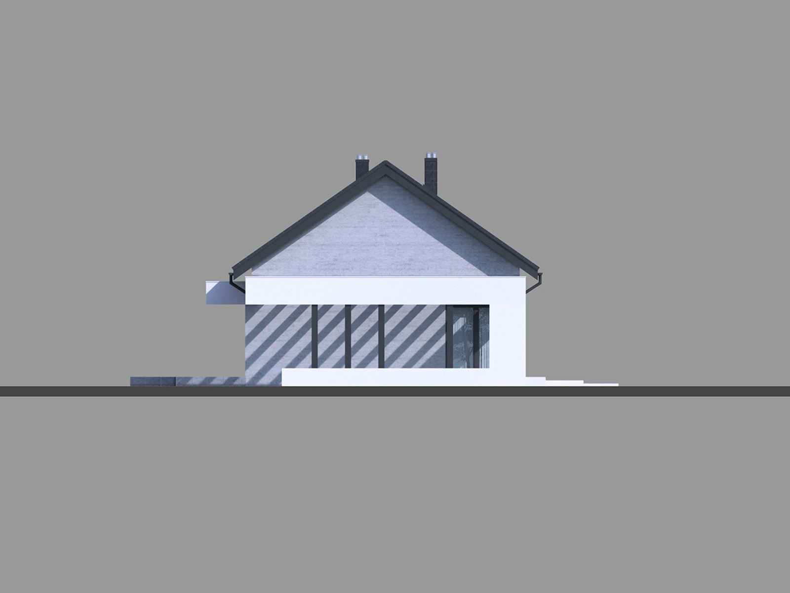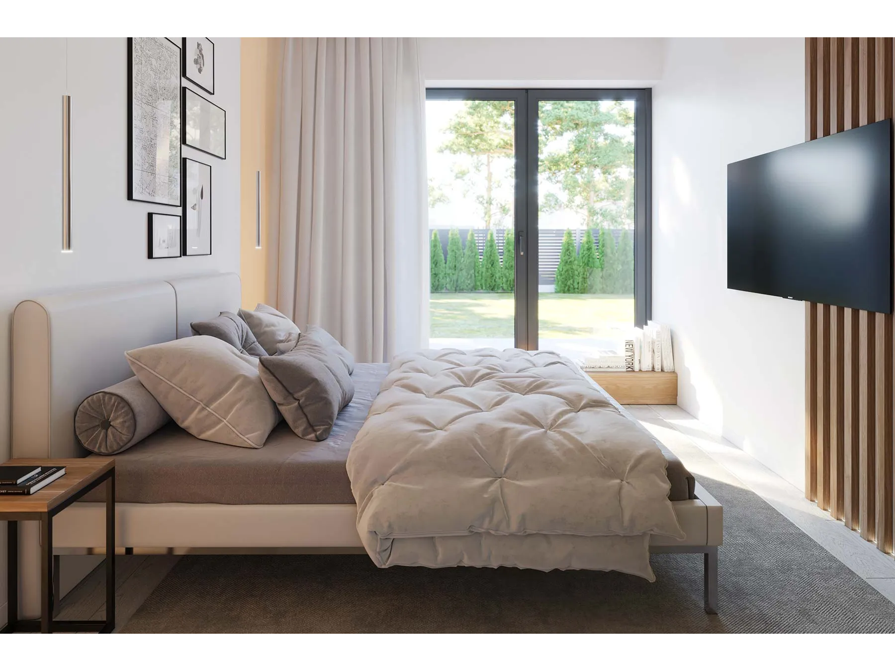 Piękny, słoneczny salon został zaprojektowany na planie kwadratu, dzięki czemu jest on bardzo ustawny i zapewnia wszystkim domownikom komfortową przestrzeń do życia. W centralnej części znajduje się kominek, który w czasie chłodniejszych dni z powodzeniem dogrzeje wszystkie pomieszczenia parteru. Częściowo zamknięta blatem roboczym kuchnia jest połączona z praktyczną spiżarnią. W części nocnej do dyspozycji mieszkańców są 4 bardzo wygodne pokoje, w tym sypialnia małżeńska z prywatną garderobą. Obok znajduje się duża łazienka z wanną i prysznicem oraz dodatkowa toaleta. Kotłownia z funkcją pralni jest dostępna bezpośrednio z wiatrołapu.