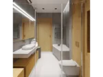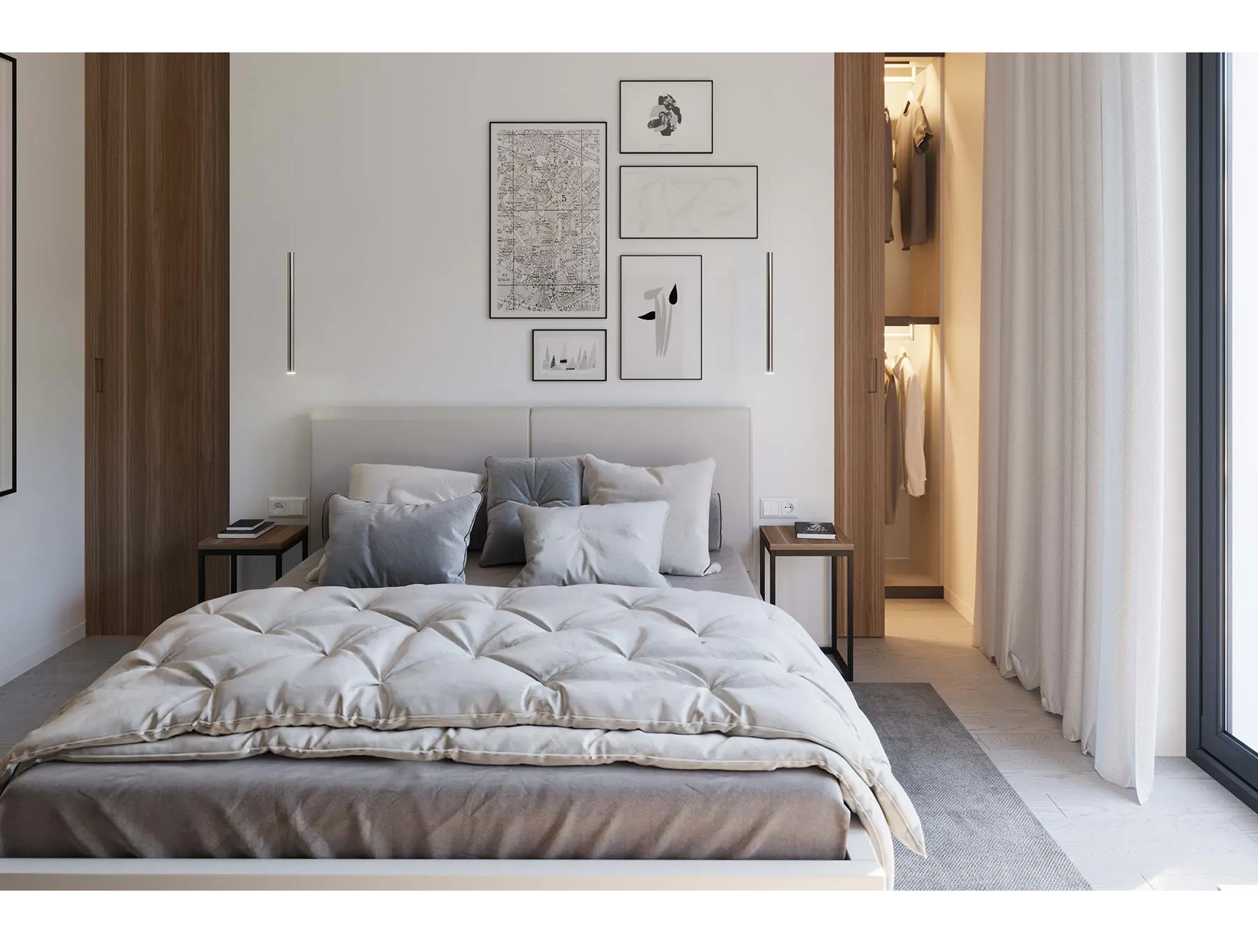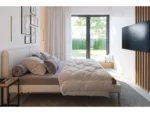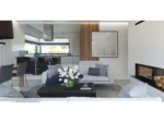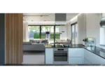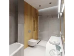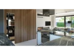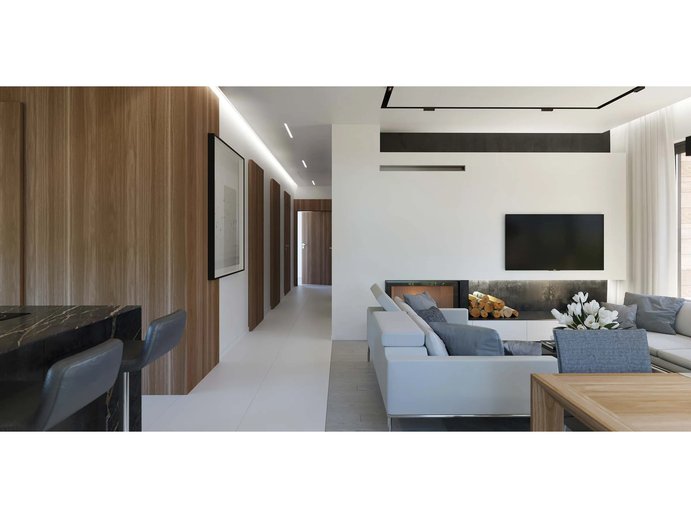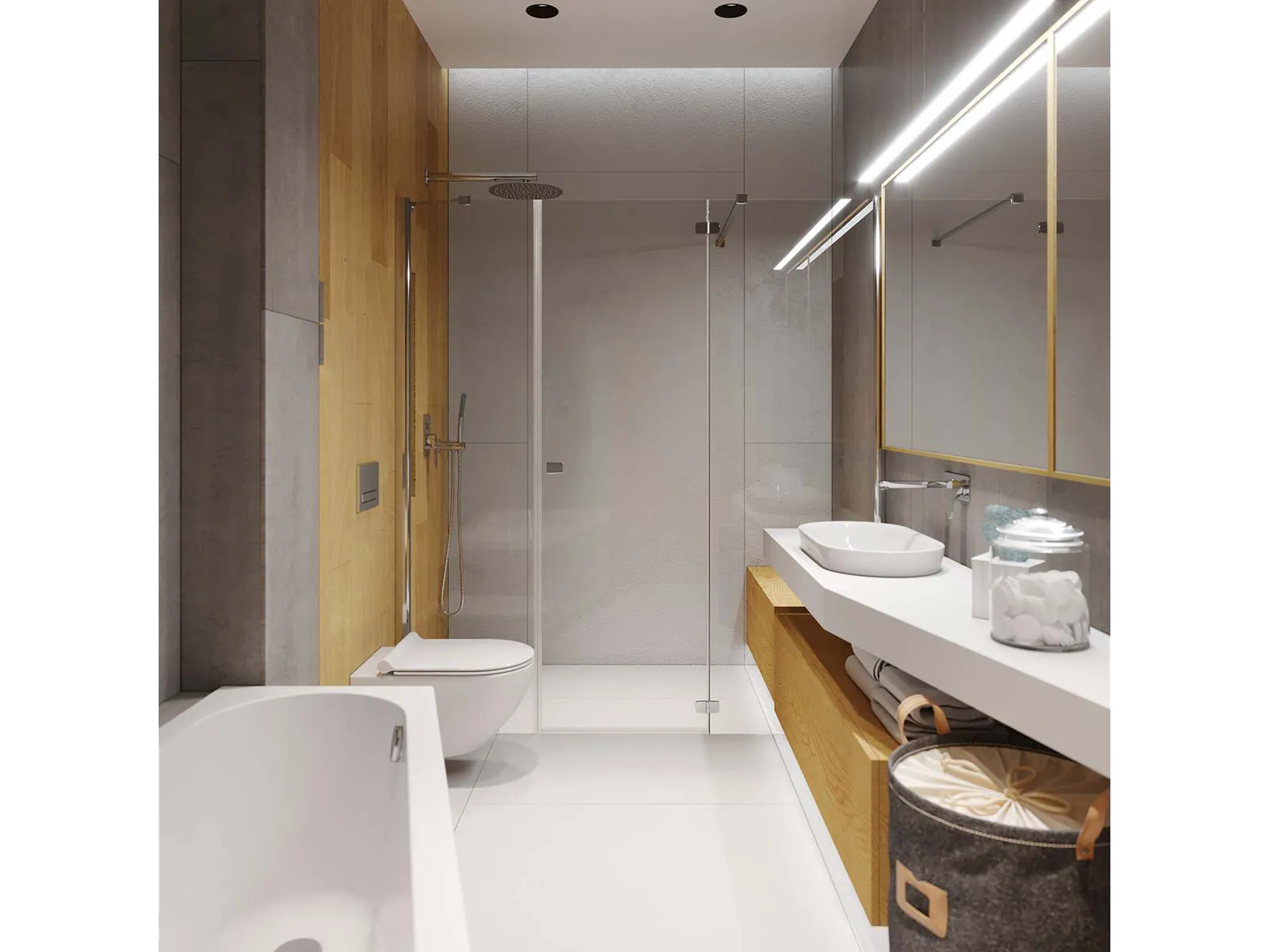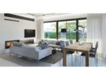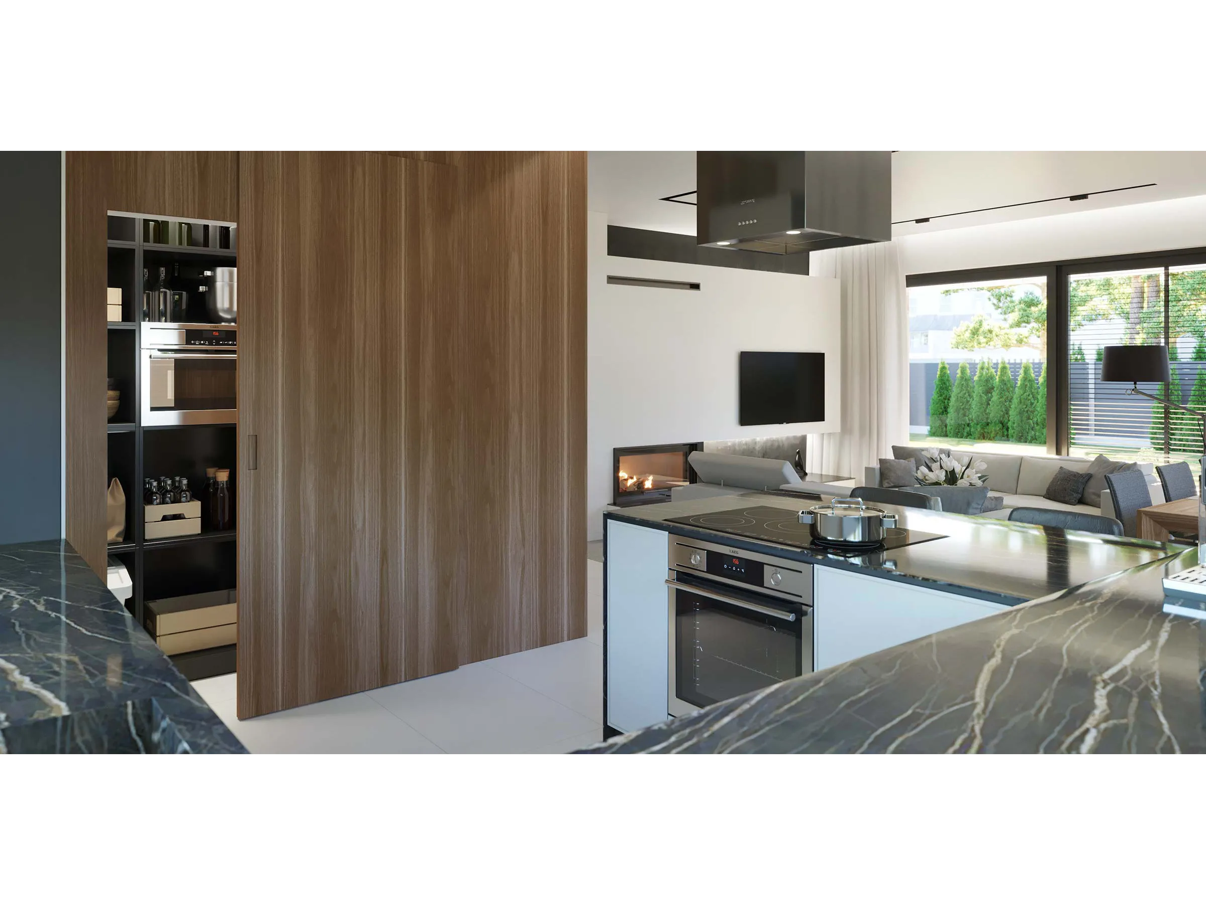 Piękny, słoneczny salon został zaprojektowany na planie kwadratu, dzięki czemu jest on bardzo ustawny i zapewnia wszystkim domownikom komfortową przestrzeń do życia. W centralnej części znajduje się kominek, który w czasie chłodniejszych dni z powodzeniem dogrzeje wszystkie pomieszczenia parteru. Częściowo zamknięta blatem roboczym kuchnia jest połączona z praktyczną spiżarnią. W części nocnej do dyspozycji mieszkańców są 4 bardzo wygodne pokoje, w tym sypialnia małżeńska z prywatną garderobą. Obok znajduje się duża łazienka z wanną i prysznicem oraz dodatkowa toaleta. Kotłownia z funkcją pralni jest dostępna bezpośrednio z wiatrołapu.