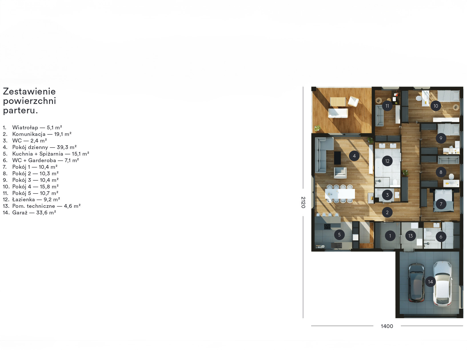 Wygodna kuchnia z widokiem na wejście, przestronny salon, a także 5 niezależnych pomieszczeń zaspokoi potrzeby wszystkich mieszkańców. Duża łazienka została zlokalizowana w centralnej części dla jeszcze większej wygody. Wejście z dużym zapleczem gospodarczym sąsiaduje z garażem.