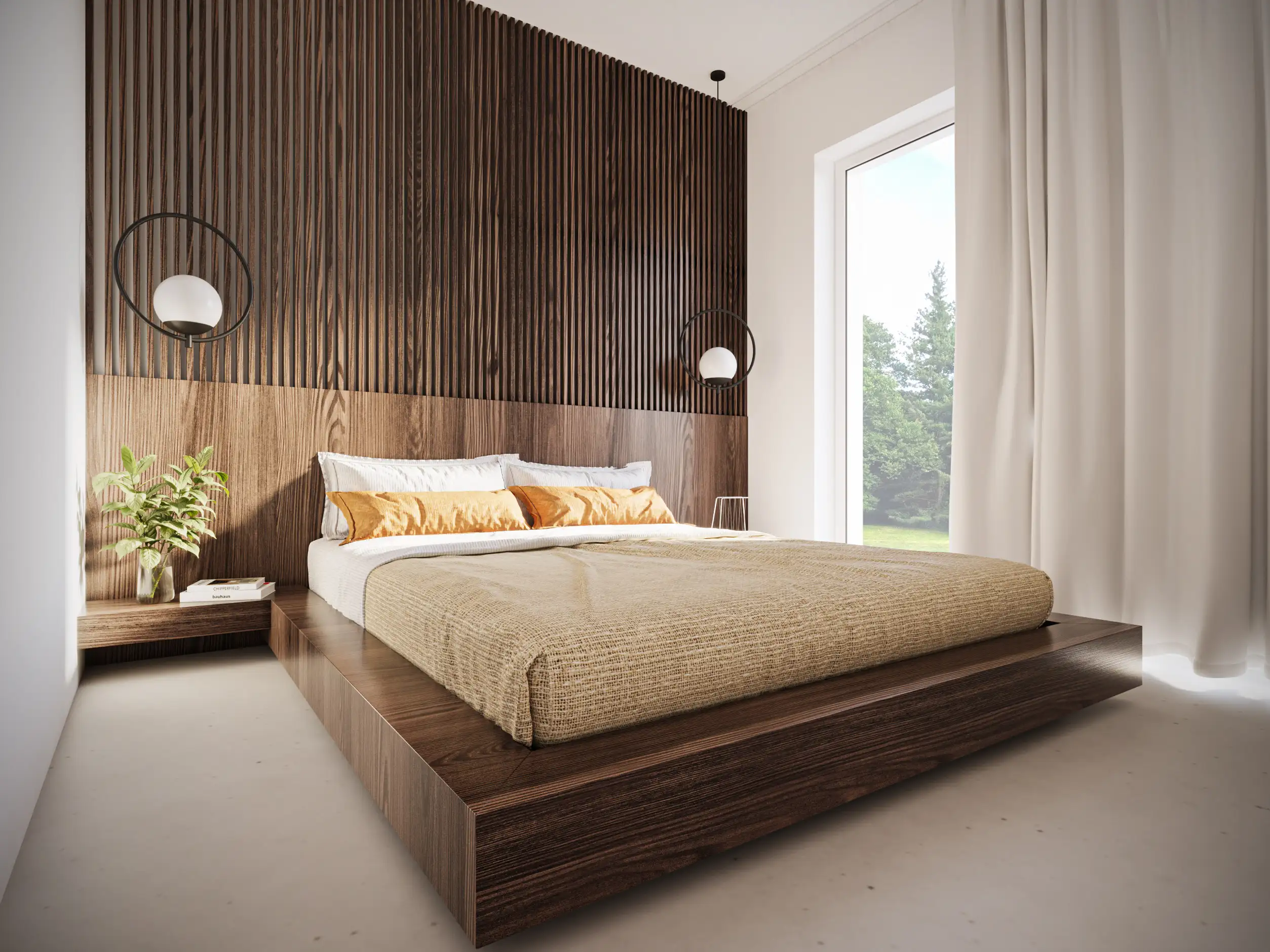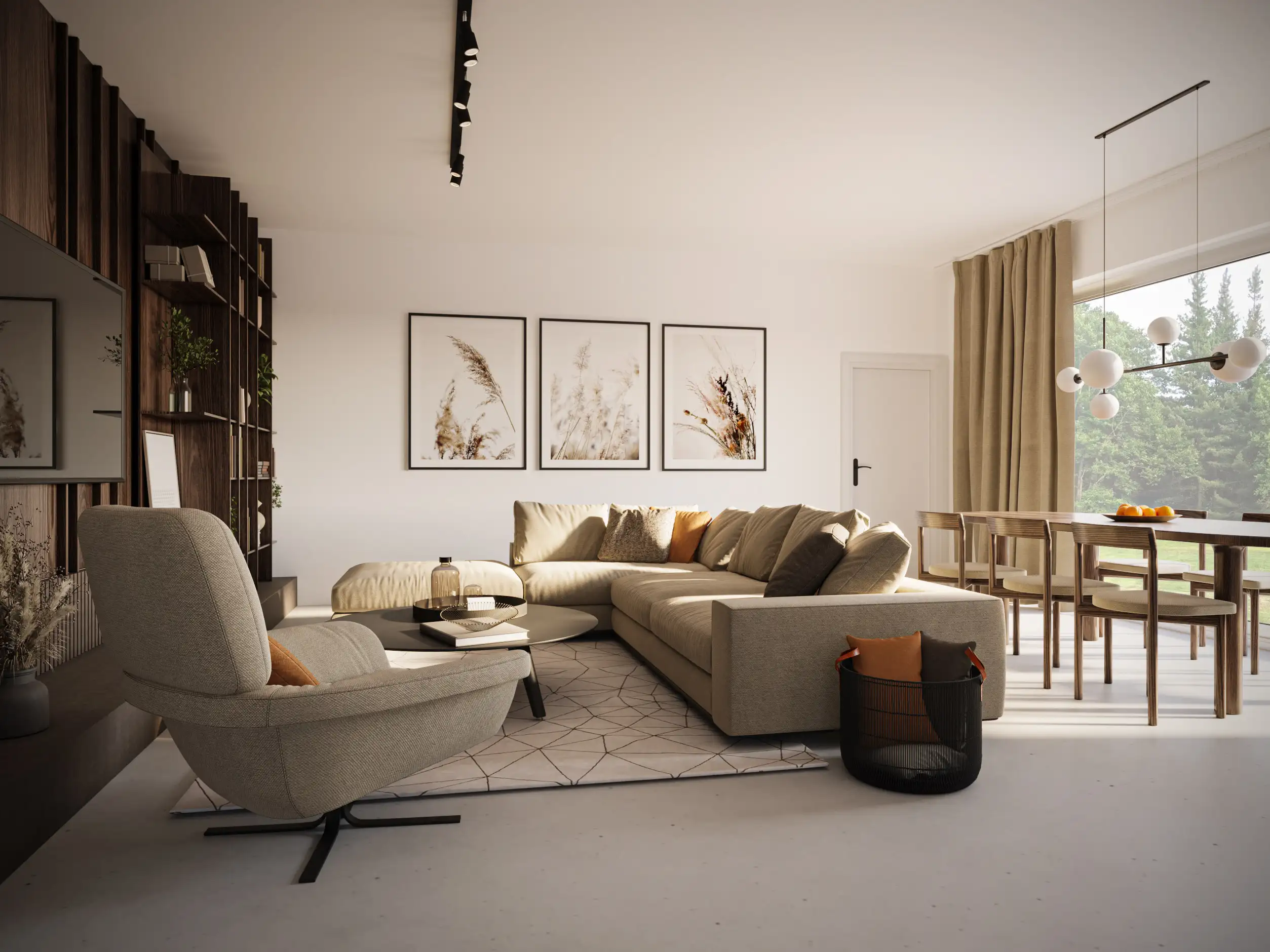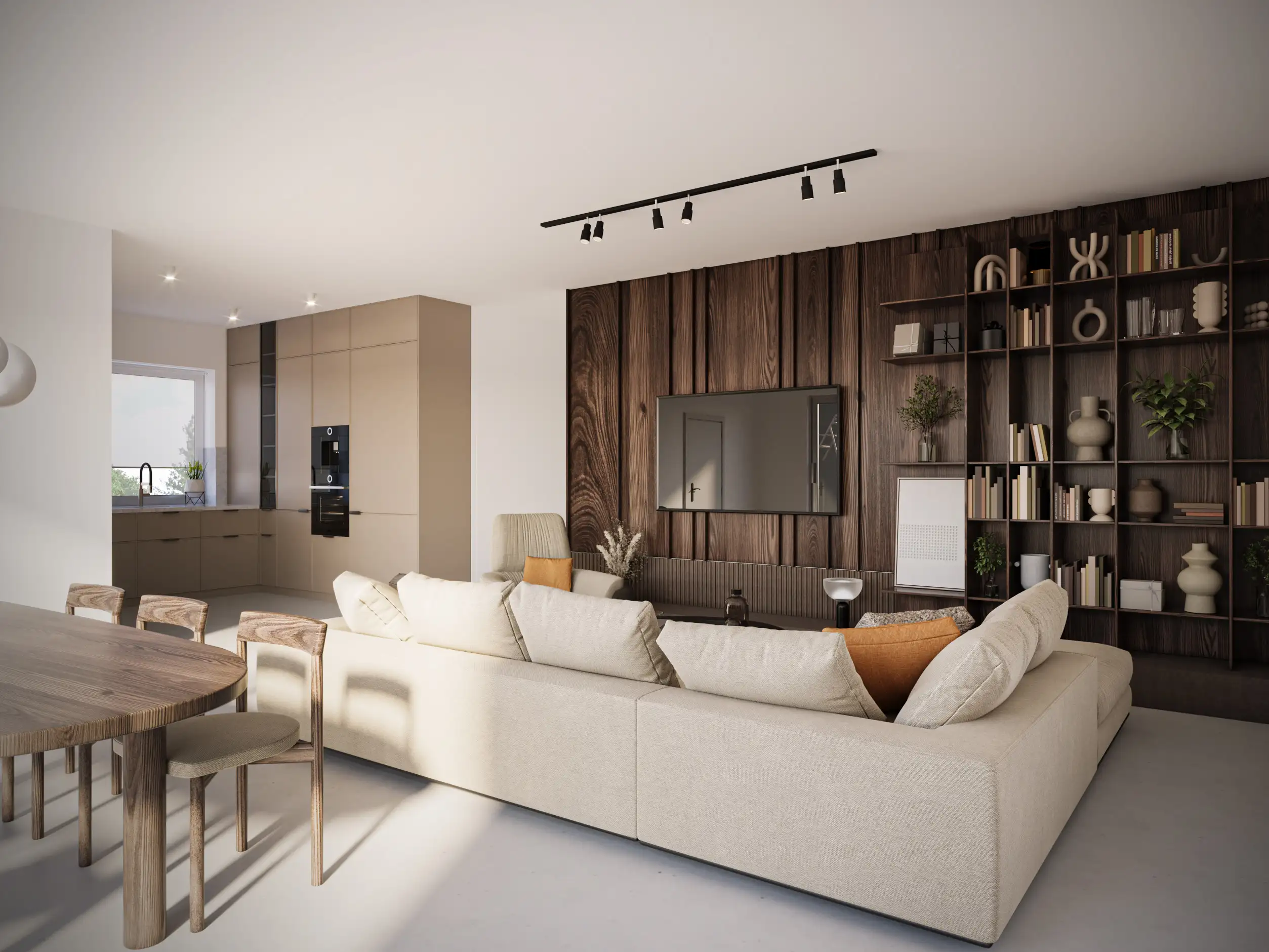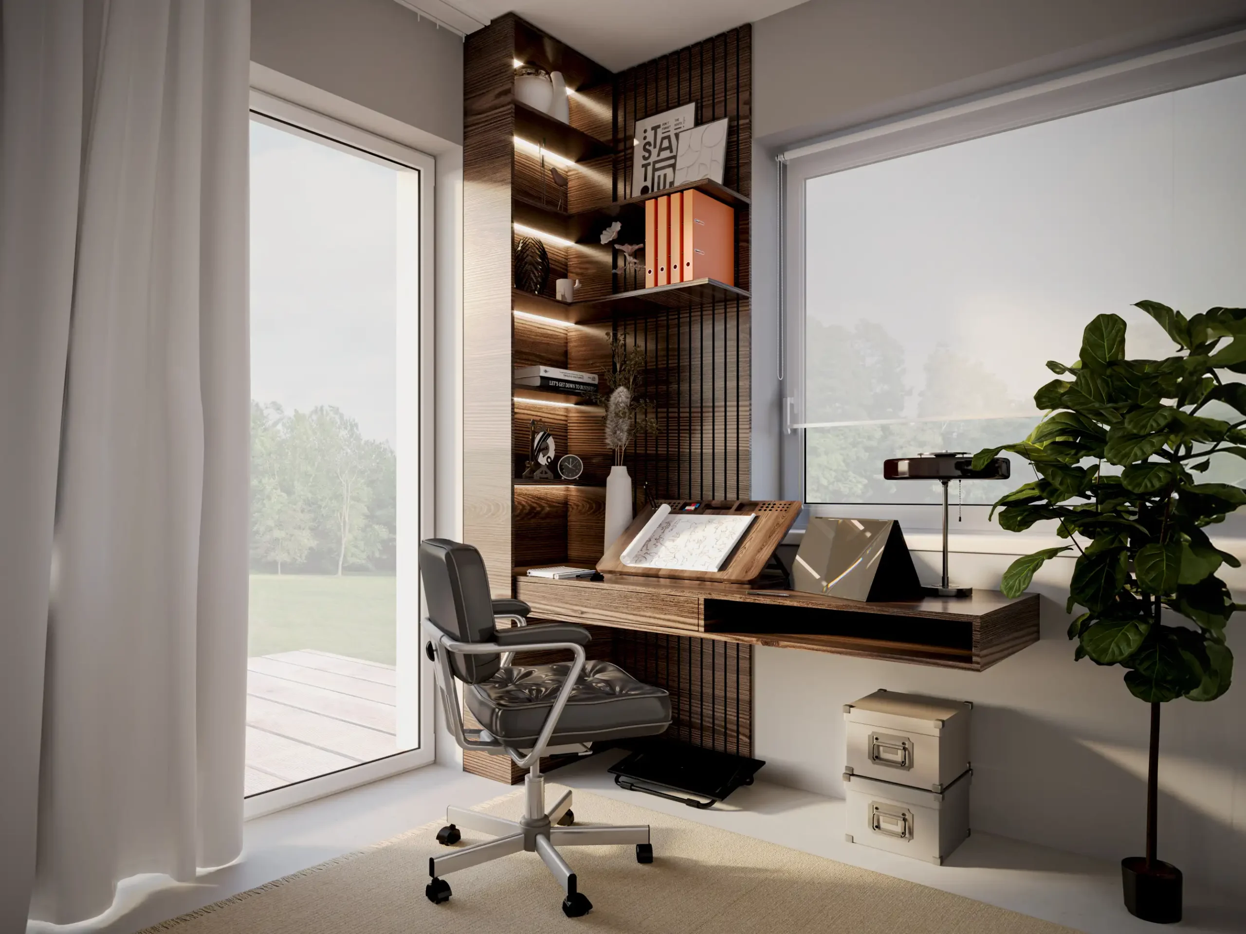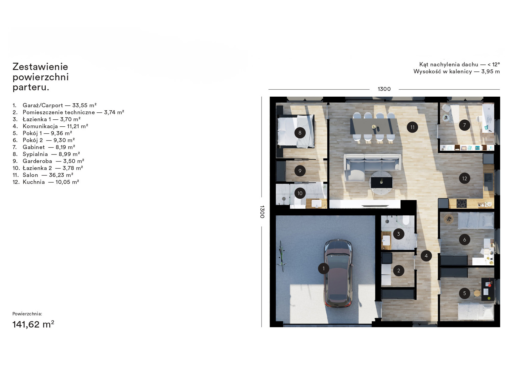 Na przestrzeni zaledwie 141 metrów zlokalizowana została strefa sypialniana oraz gospodarcza. Przestronny salon z jadalnią i wnęką kuchenną z możliwością zabudowy. Ze strefy dziennej możemy łatwo przejść do jasnego gabinetu. Główna sypialnia mieści się na skraju domu, tak by zachować prywatność, w jej skład wchodzi przechodnia garderoba prowadząca do łazienki. Głównym atutem sypialni jest widok na ogród i wyjście na taras. Najciekawszym rozwiązaniem wprowadzonym w projekcie P.8 jest miejsce na auto, które możemy rozwiązać na dwa sposoby. Jako carport (bez bramy) lub jako zamykany garaż.