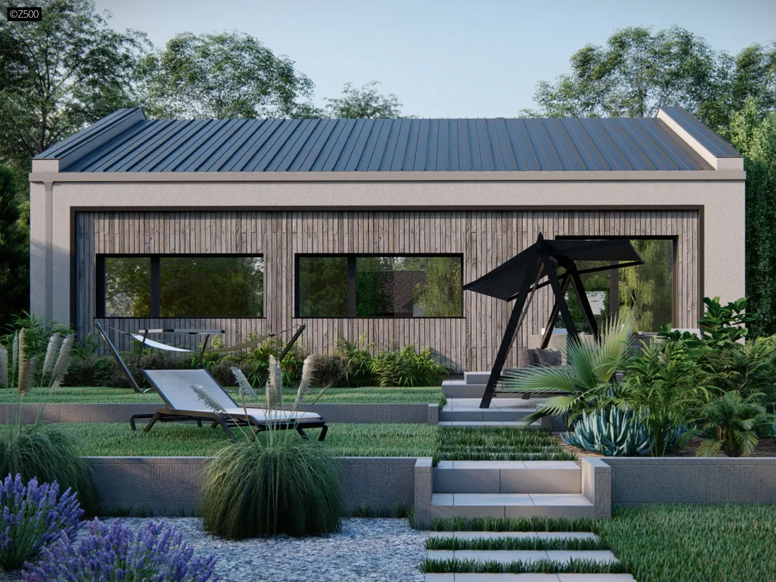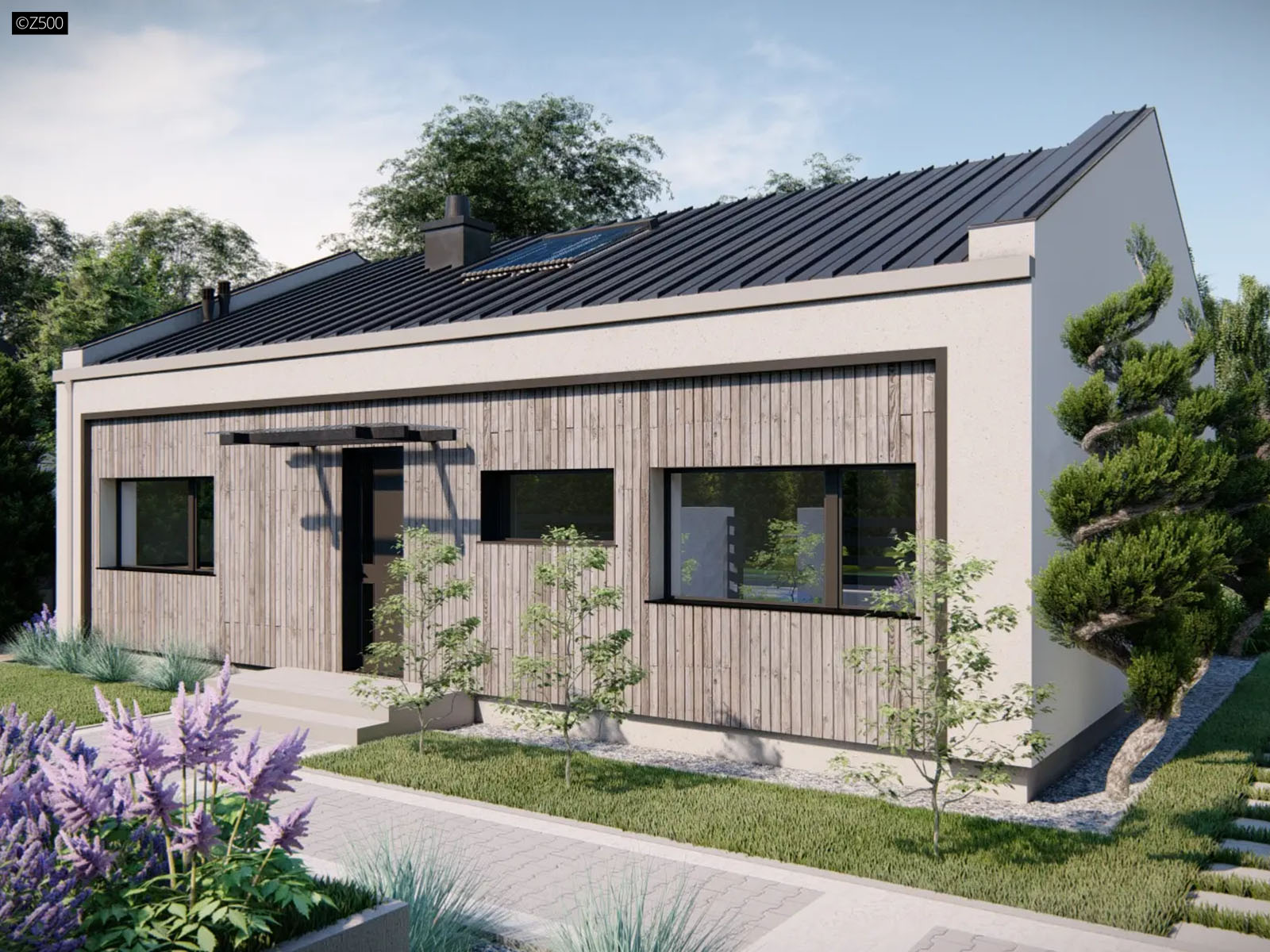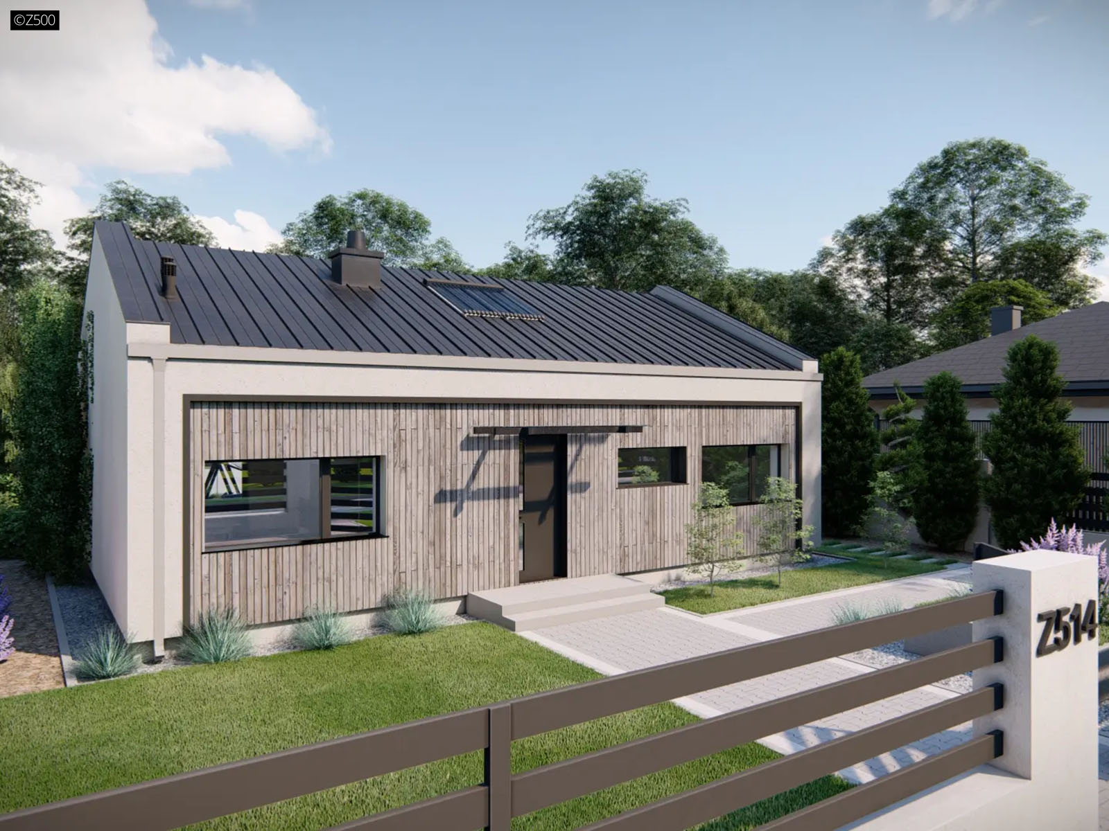 Z514 to mały, funkcjonalny oraz nowoczesny dom. Dzięki prostej bryle dom jest tani w budowie oraz utrzymaniu. Ciemne antracytowe okna oraz drewno na elewacji daje nowoczesny charakter. Ponadto pomieszczenia posiadają duże szerokie okna, które zapewniają korzystniejszą ekspozycję na światło dzienne. Dodatkowo ich horyzontalny kształt podkreśla nowoczesność domu.
