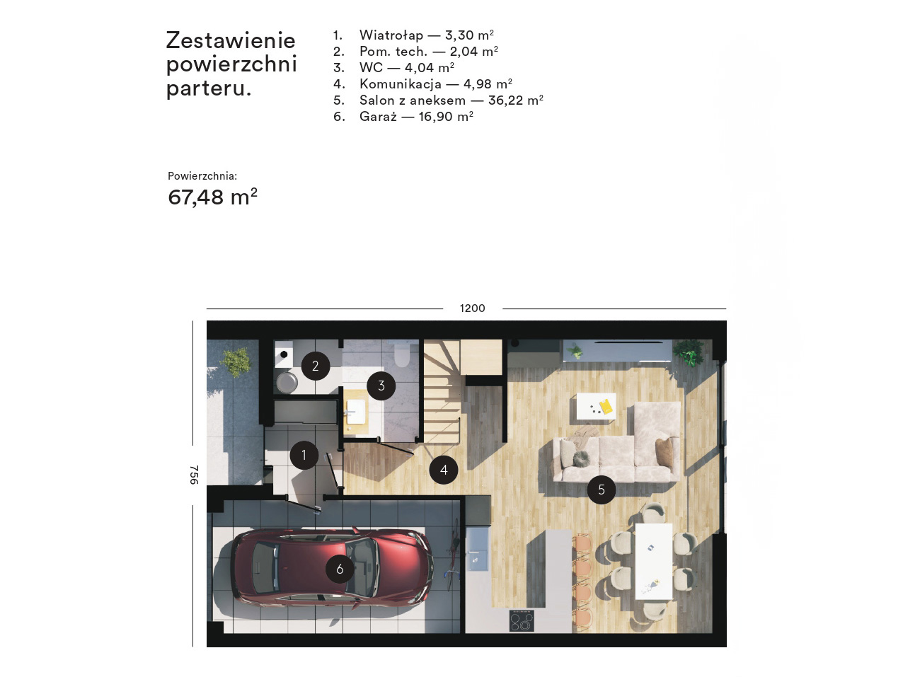 Na wejściu znajduje się wiatrołap z przestronną szafą oraz łazienka połączona z pomieszczeniem technicznym. Otwarta kuchnia, miejsce na duży stół oraz strefa wypoczynkowa tworzą idealną przestrzeń do spędzania wspólnego czasu z bliskimi.