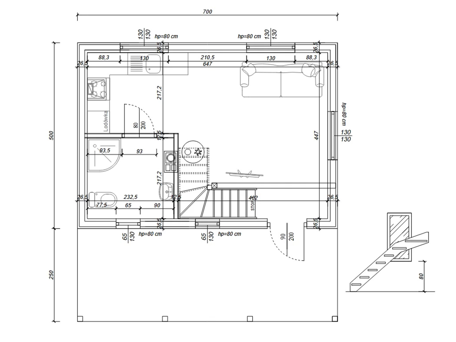 - Strop - belki stropowe KVH 180 x 60 mm (certyfikat C24) - strugane czterostronnie - fazowana, suszona do max 16-18% wilgotności, deska stropopodłogowa 28 mm (strop otwarty) / OSB 22 mm