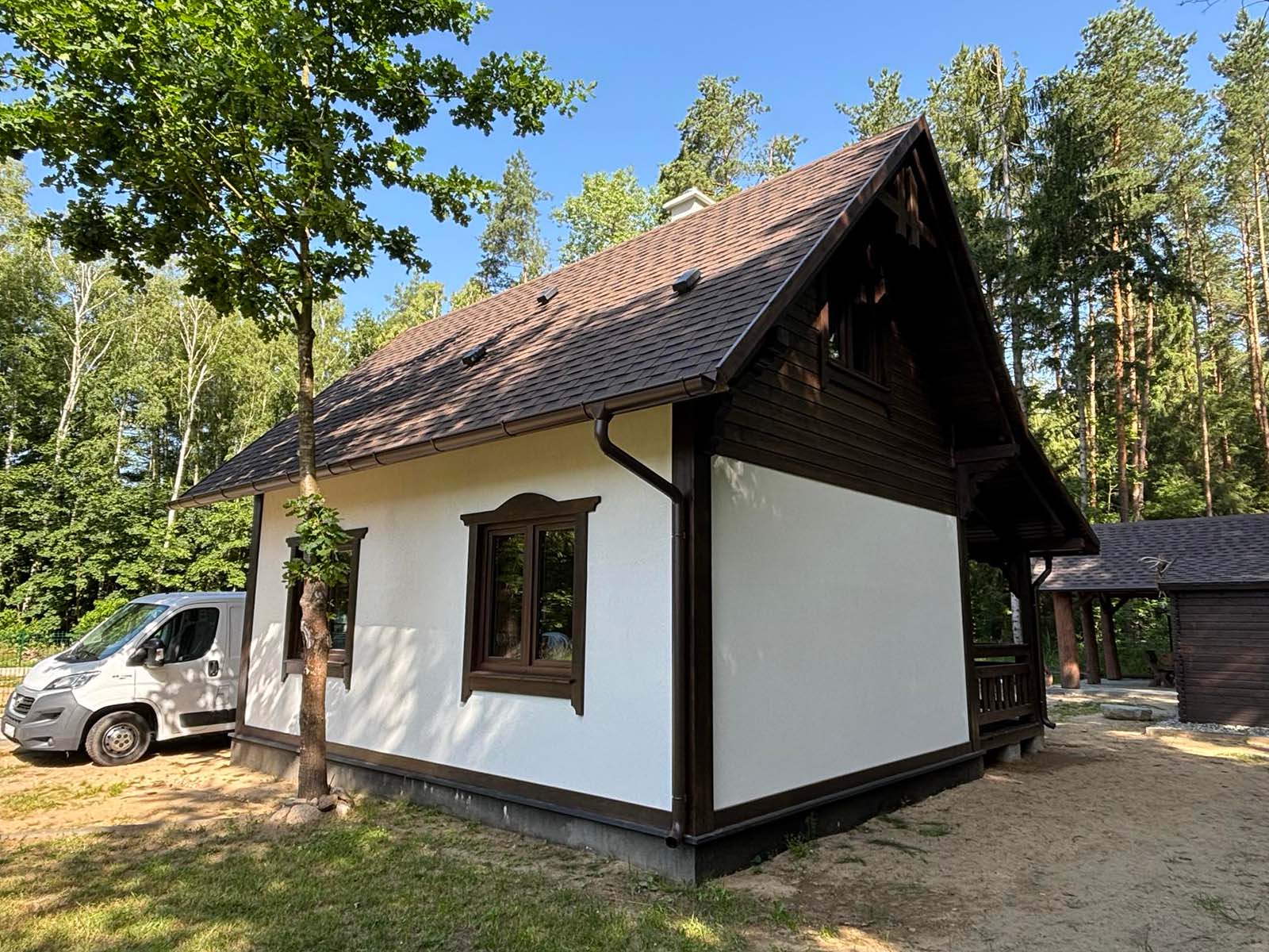- Dach - krokwie lite KVH 180 x 60 mm, strugane czterostronnie - fazowane, suszone do max 16-18% wilgotności, podbitka malowana na wybrany kolor farbami Teknos, blachodachówka Bratex, orynnowanie metalowe, ława i stopnie kominiarskie (gwarancja 45 lat)