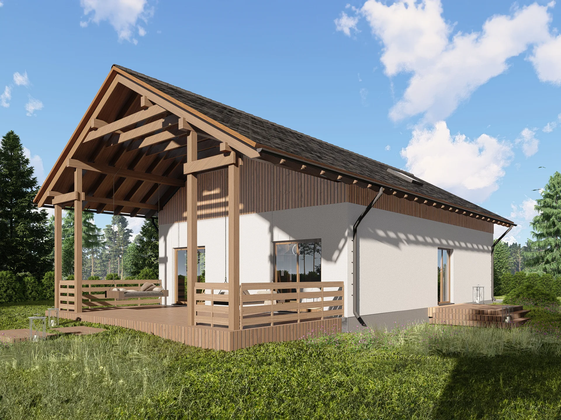 - Prefabrykacja ścian (konstrukcja z drewna KVH o przekroju 160×60 mm w ścianach zewnętrznych i 240×60 mm w przypadku stropów)