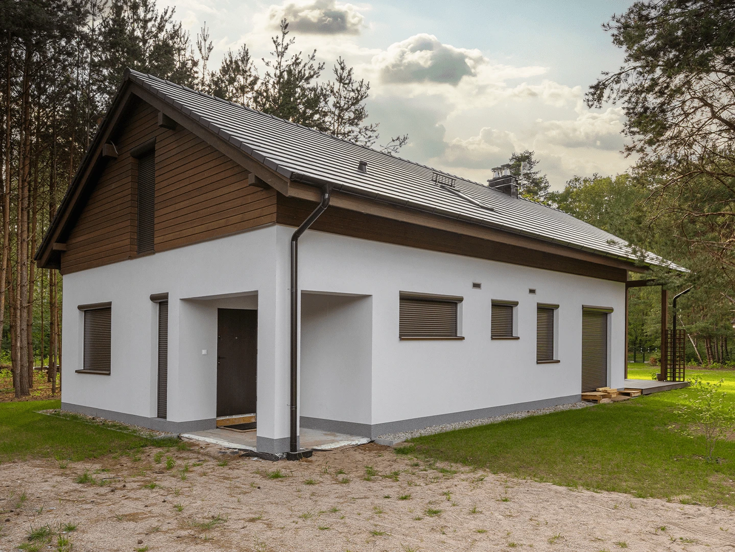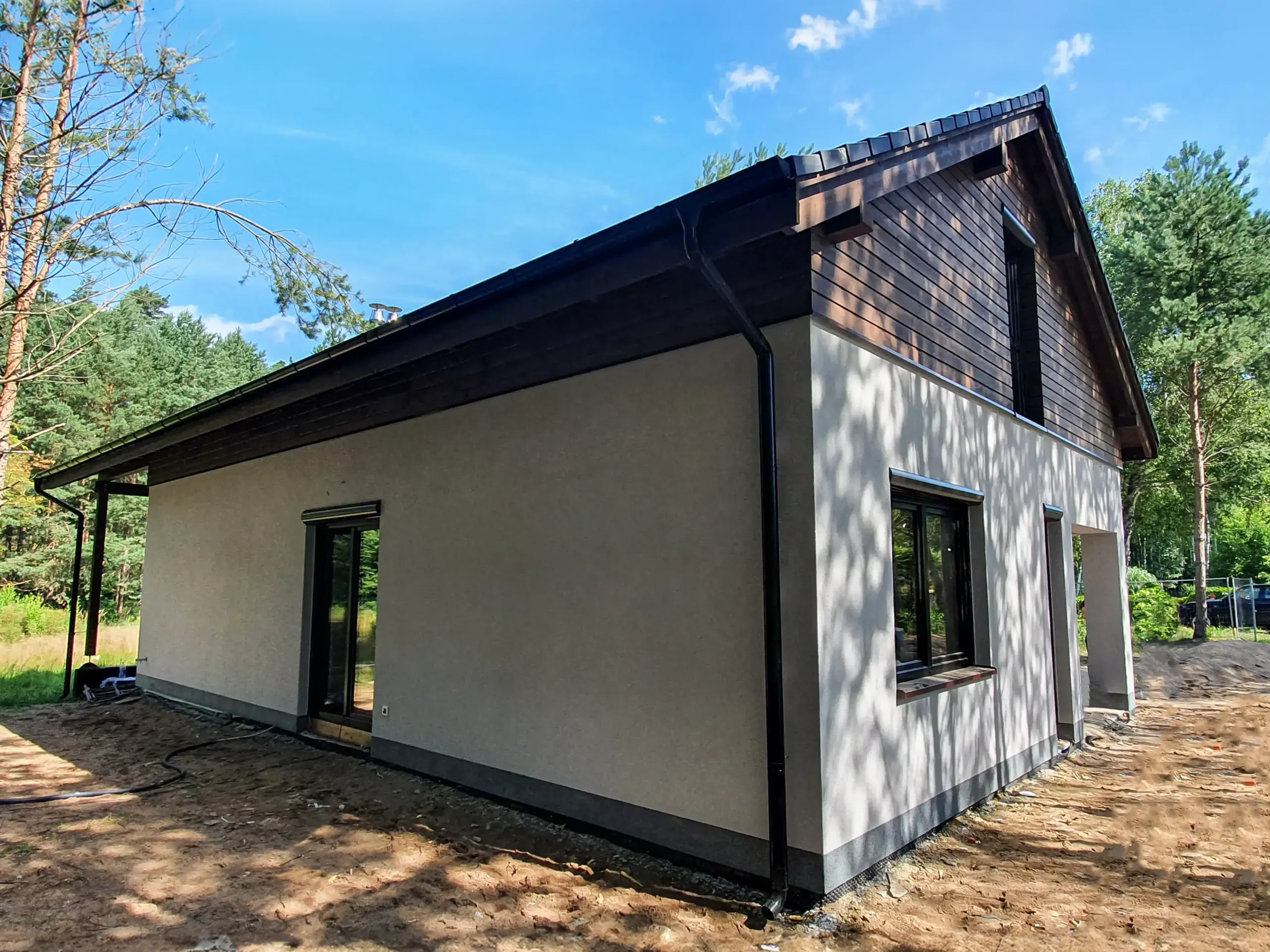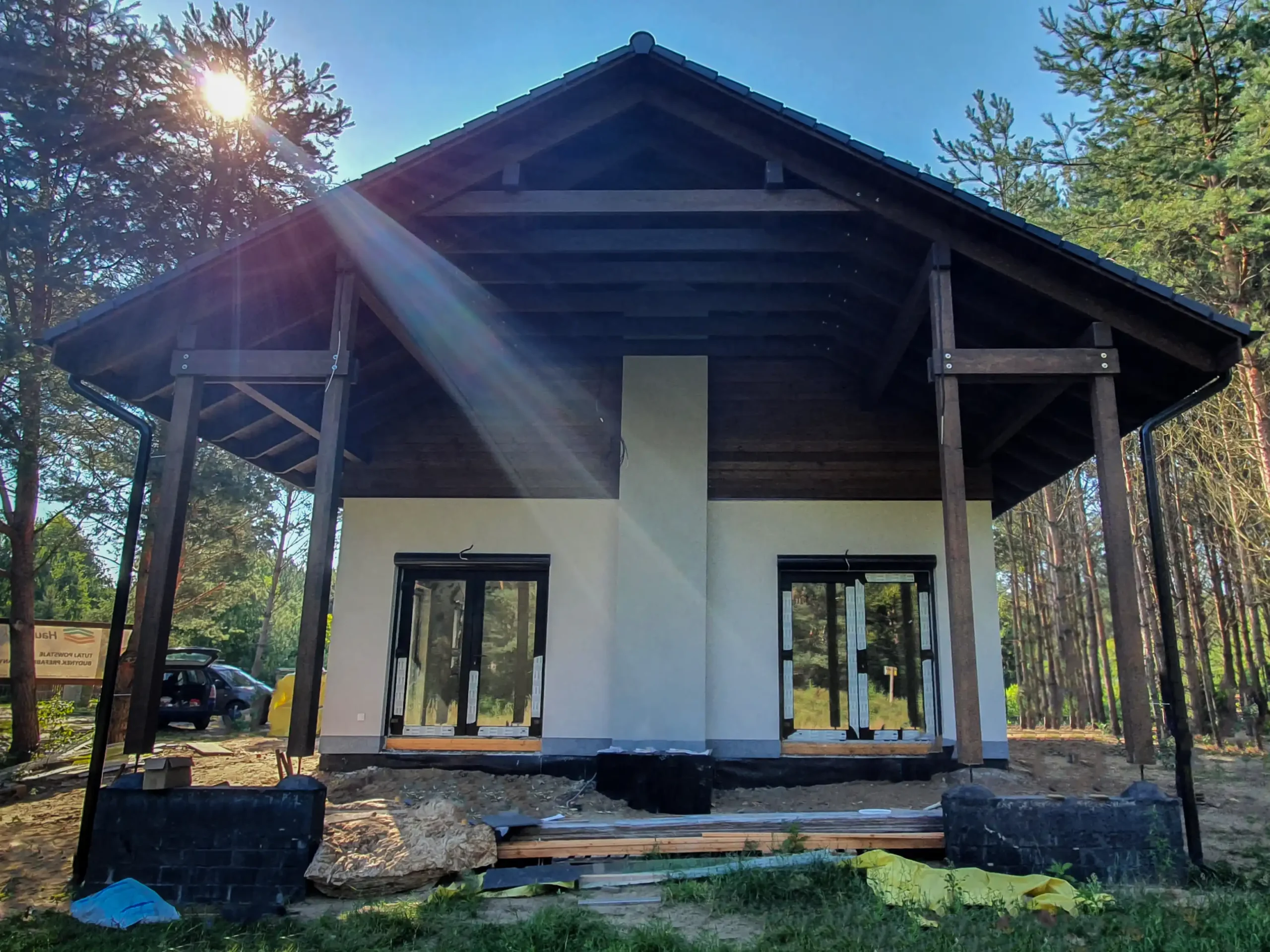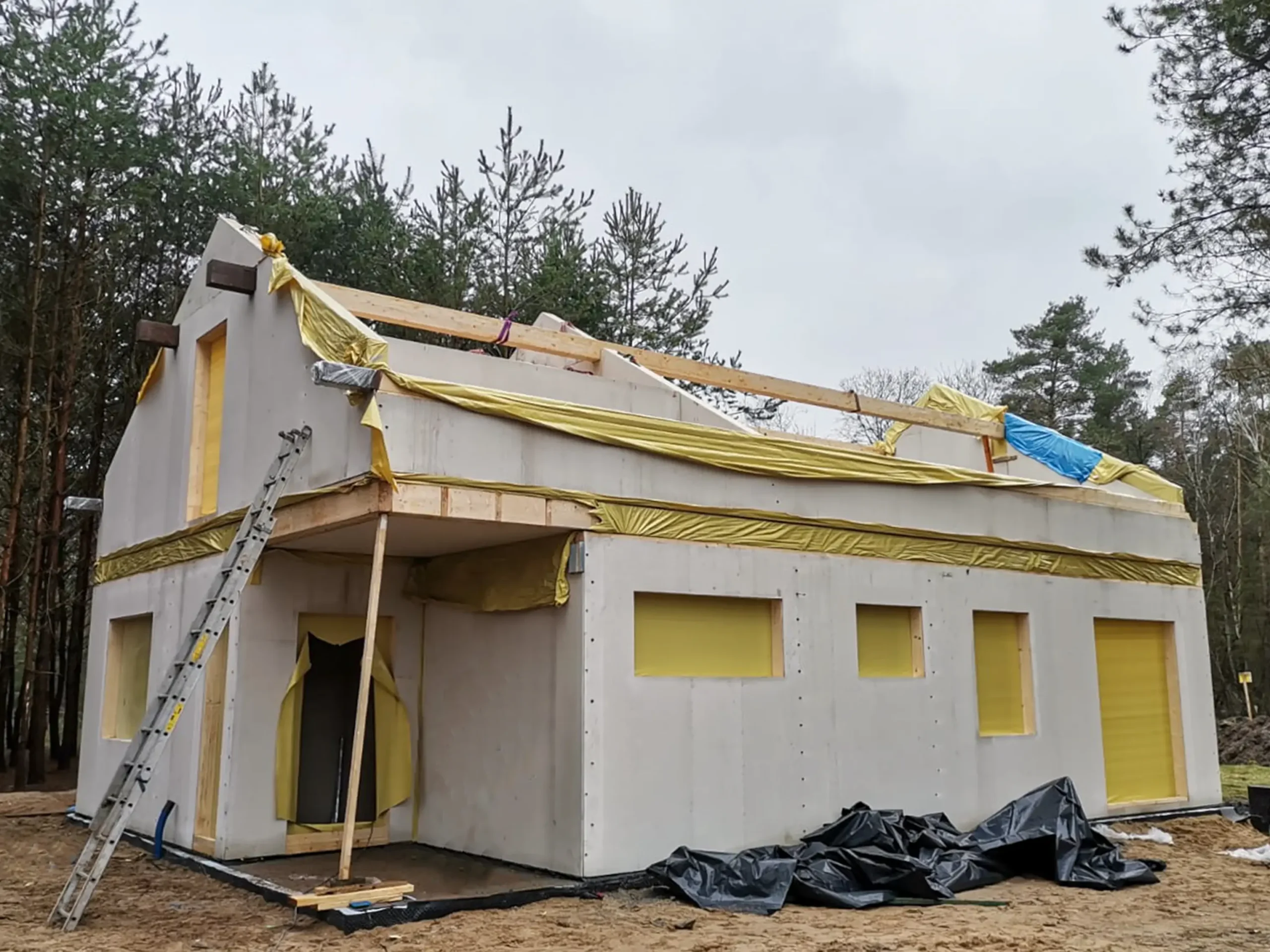 - Zamknięta konstrukcja domu z pokryciem dachowym (dach pokryty blachodachówką wraz z membraną dachową)