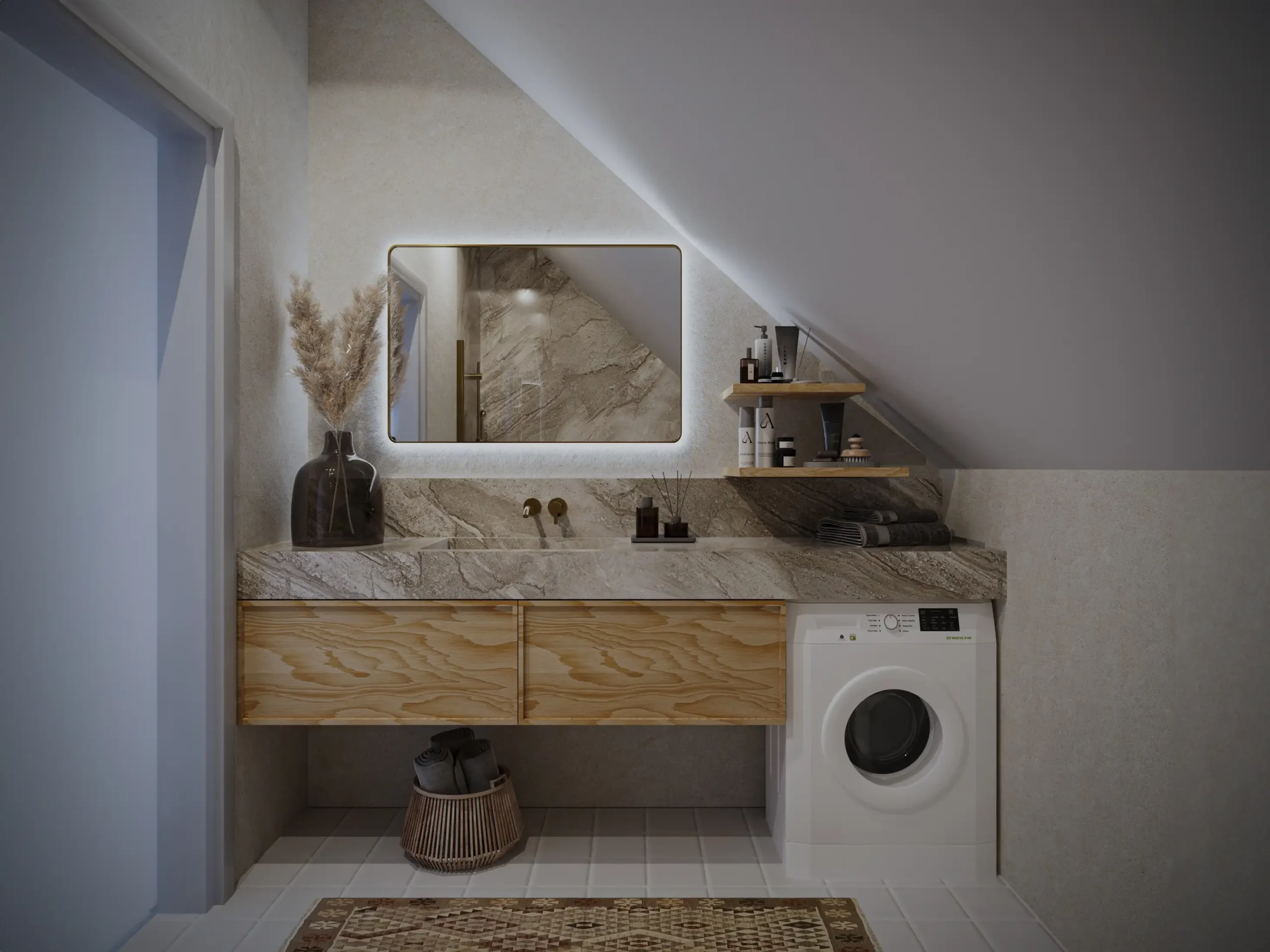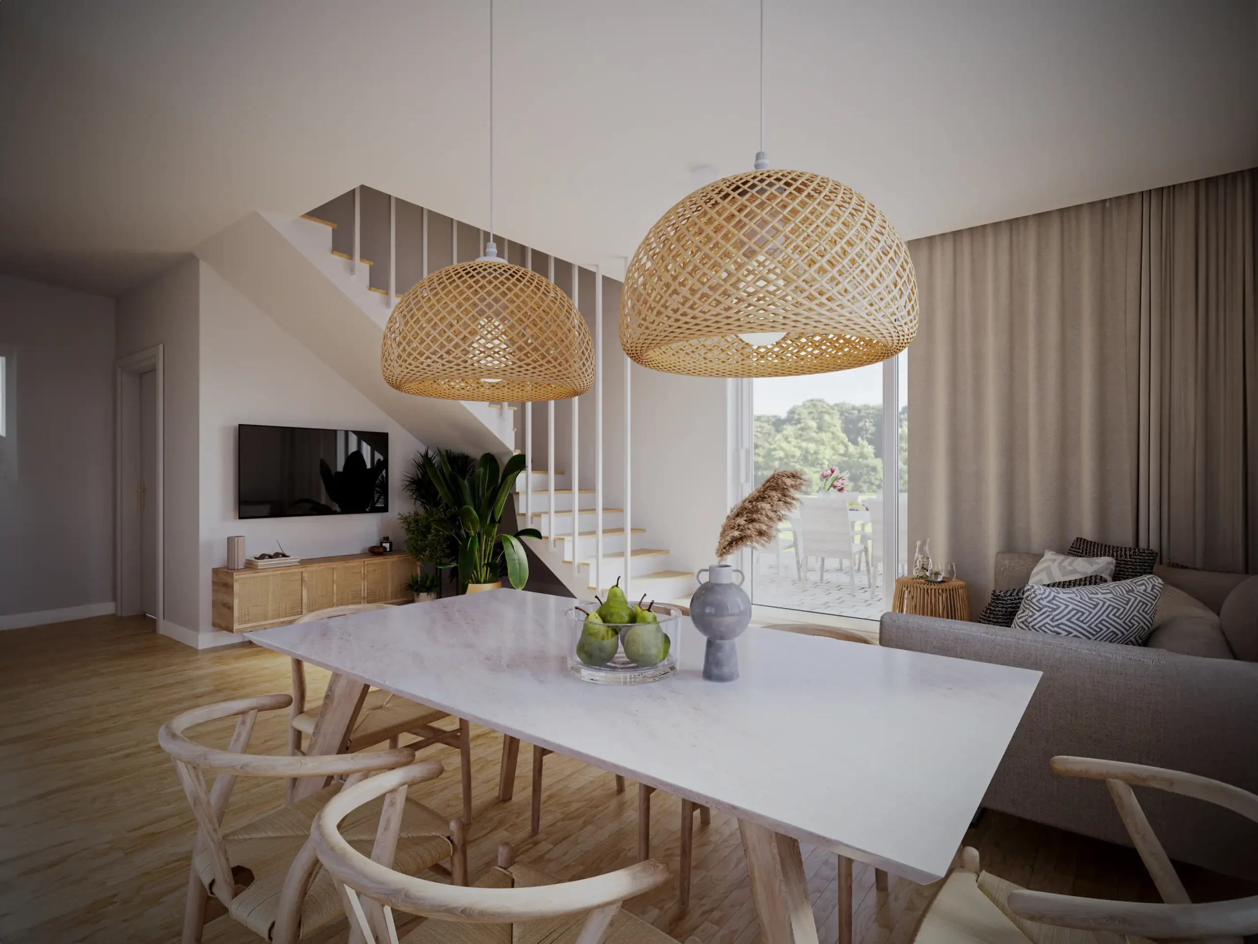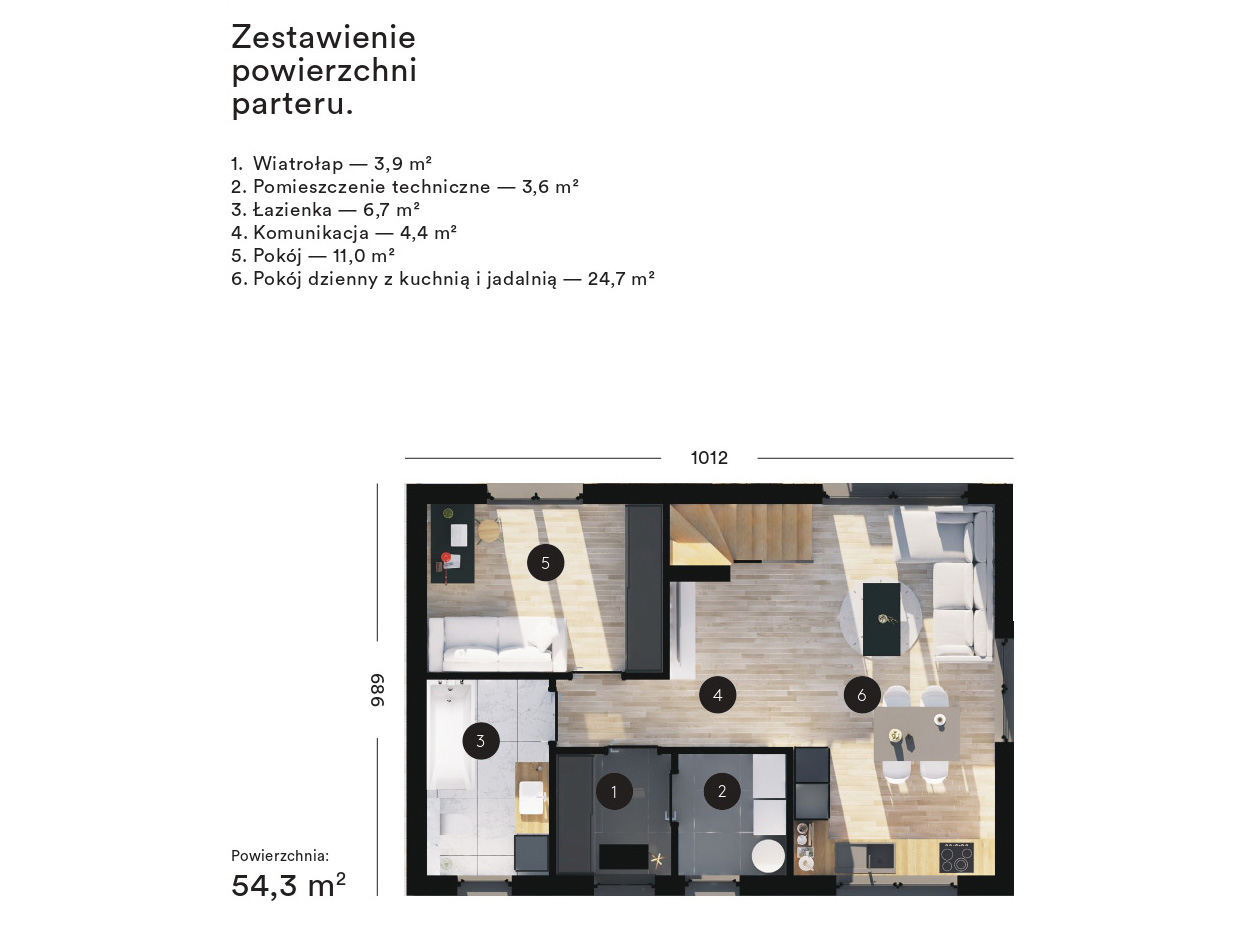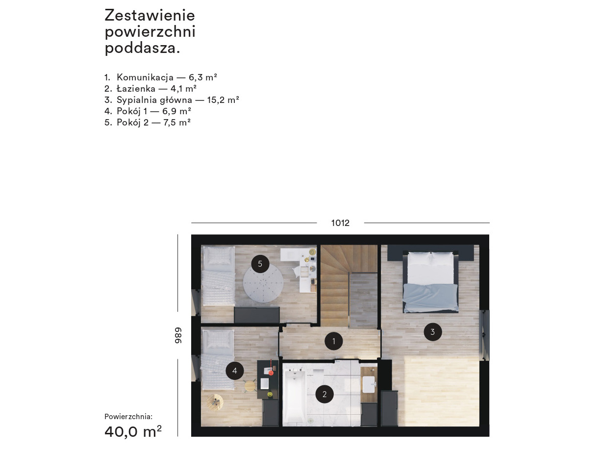 Na parterze mieszczą się funkcje strefy dziennej - otwarta kuchnia, miejsce na duży stół oraz strefa wypoczynkowa wraz z dodatkową sypialnią z dostępem do pełnowymiarowej łazienki. Na piętrze zaś znajdują się dwa przestronne pokoje, łazienka oraz jasna sypialnia, w której istnieje możliwość wydzielenia garderoby.