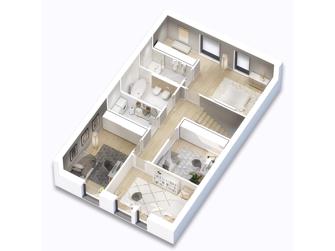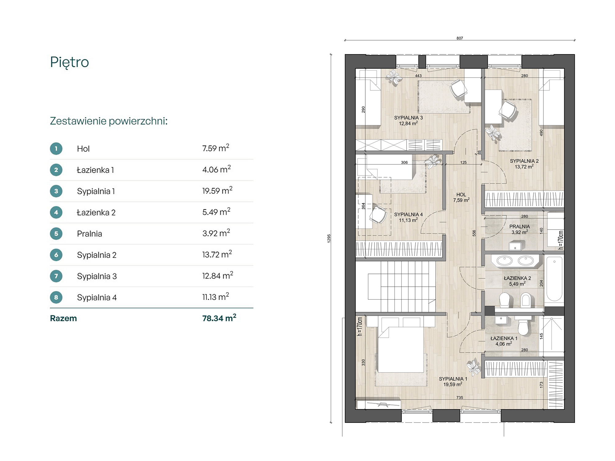 - Posadzka na piętrze: strop (płyty HC), na stropie styropian min. 5 cm oraz wylewka cementowa mim. 5 cm wraz z ogrzewaniem podłogowym