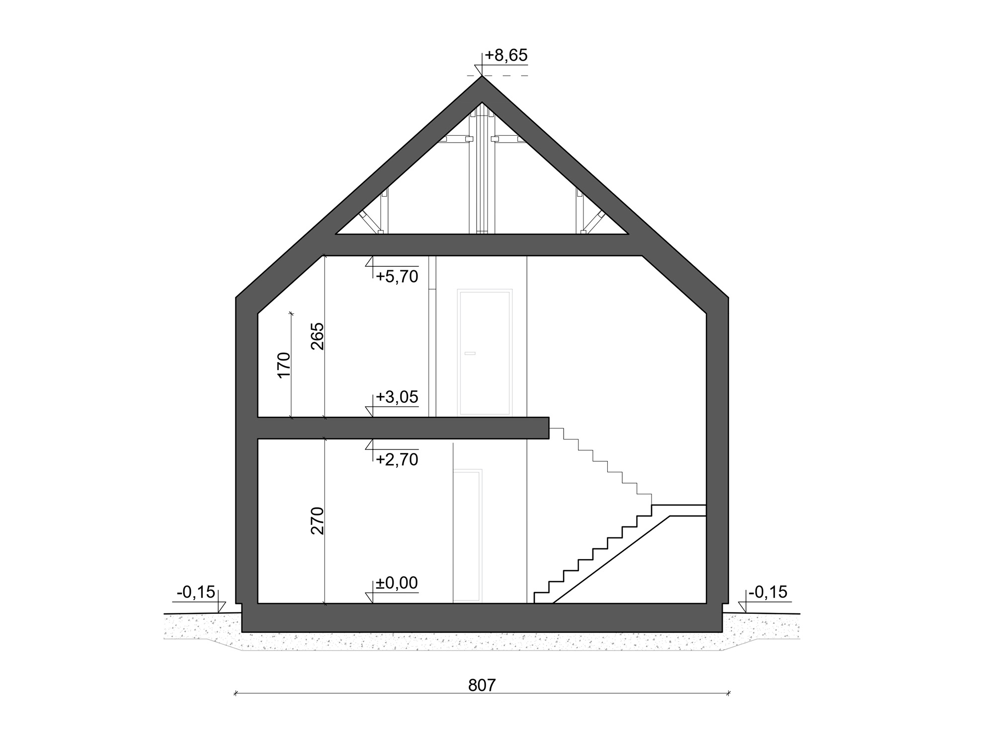 - Dach (w przypadku typu domu z dachem spadzistym), więźba dachowa drewniana, pokrycie dachu – blacha na rąbek (bez podejść kominiarskich i śniegochwytów na dachu), ocieplenie wełną mineralna gr. 25 cm min. Λ - 0,035W/m²K