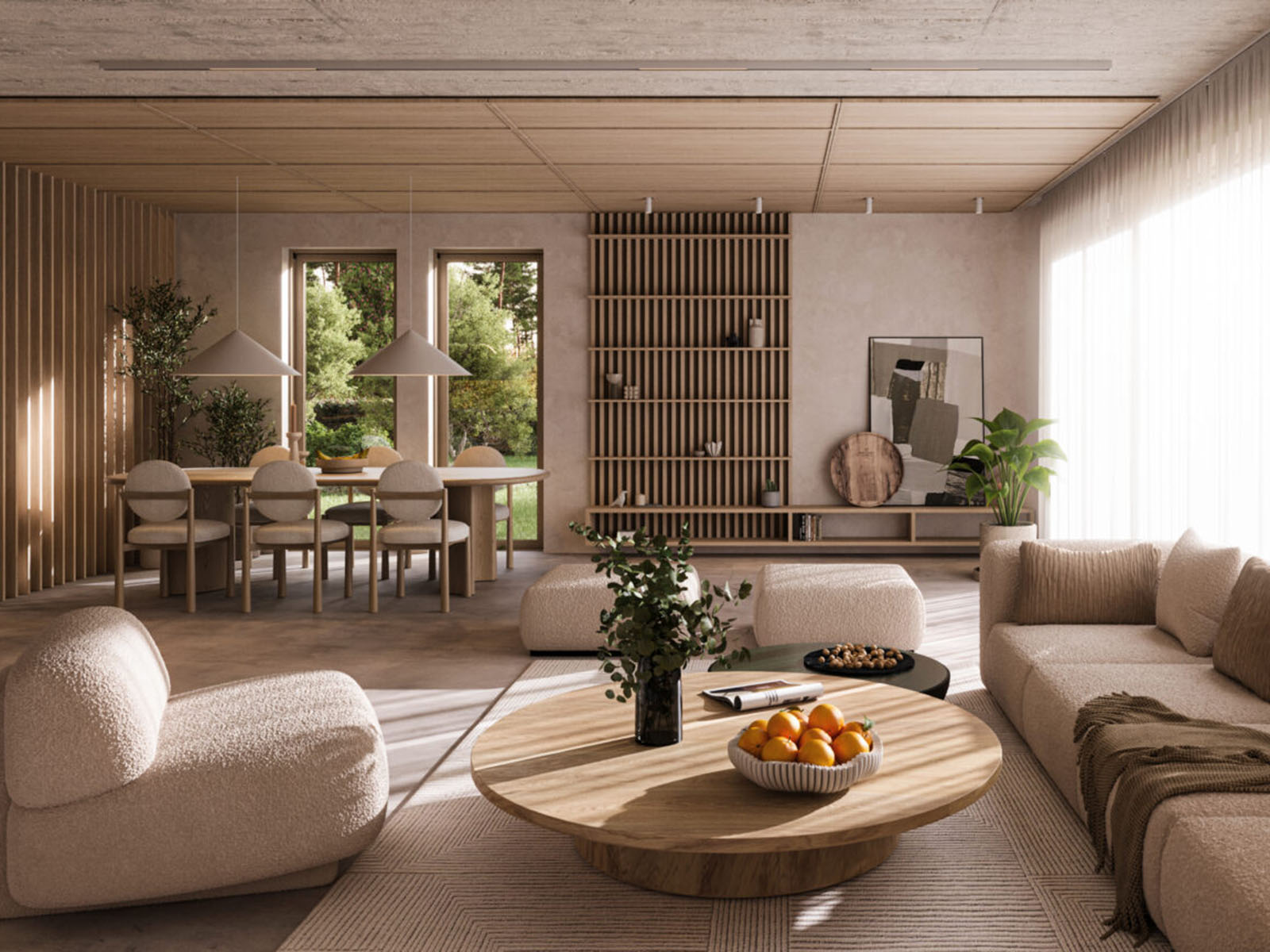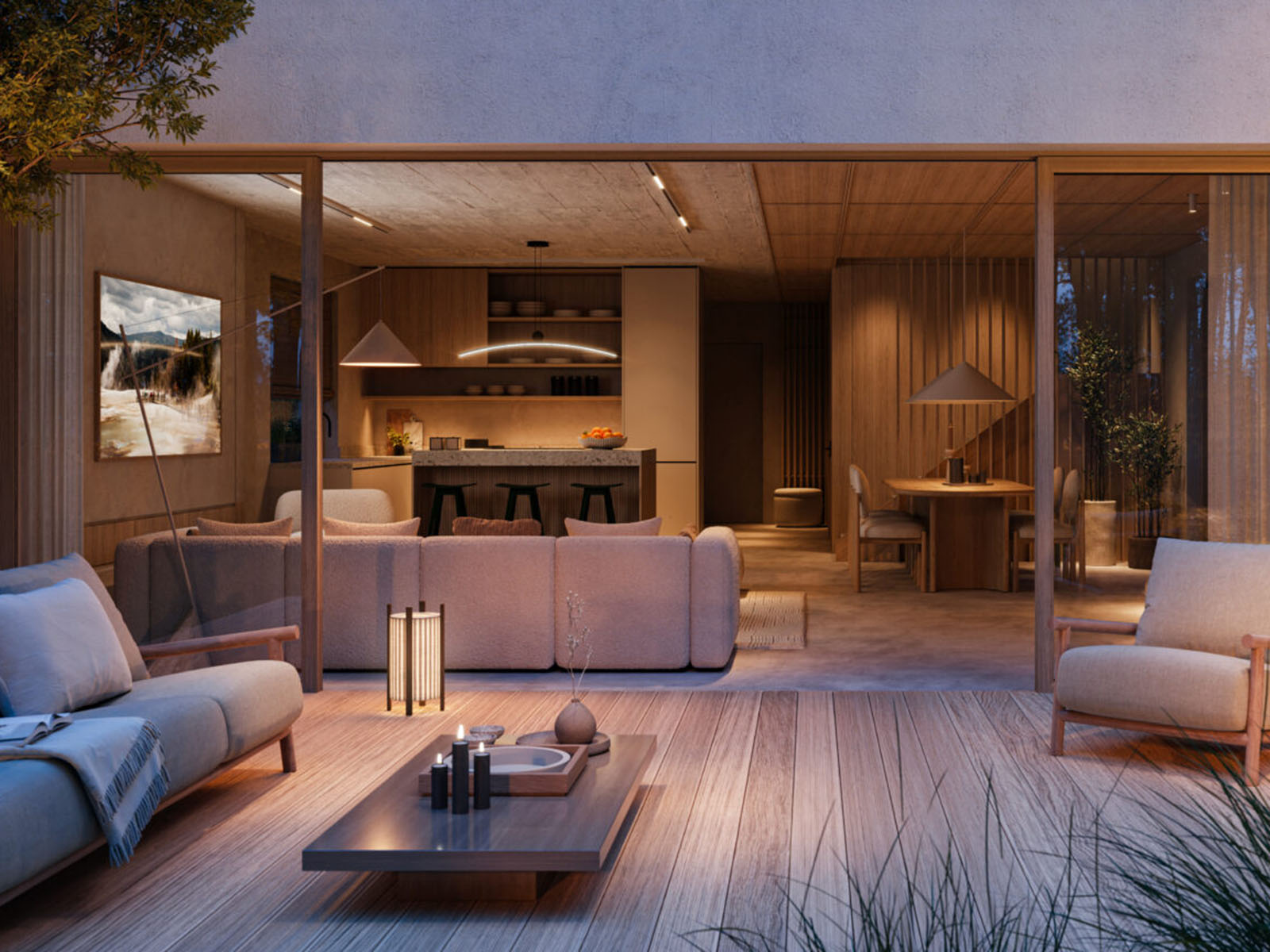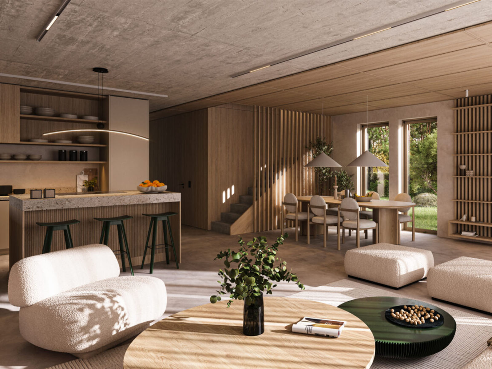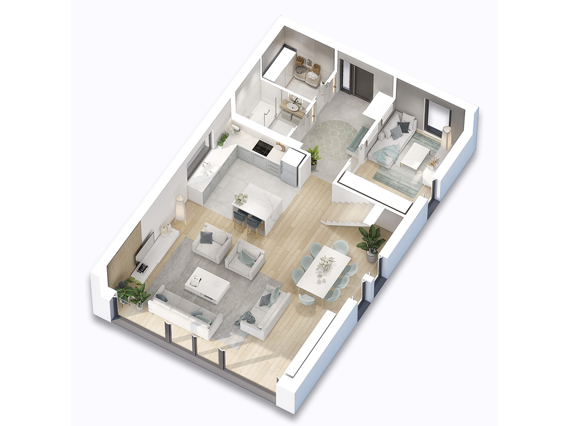 Parter składa się z salonu z jadalnią (47 m²) i otwartej kuchni, gabinetu mogącego pełnić funkcję pokoju gościnnego oraz łazienki. Na piętrze znajduje się główna sypialnia z prywatną łazienką i garderobą, pralnia oraz trzy dodatkowe sypialnie.