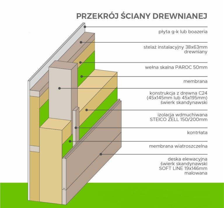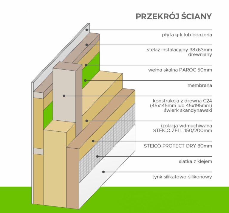 Budujemy w technologii szkieletowej (częściowo prefabrykowanej), co zapewnia trwałość, solidność oraz komfort użytkowania. Stosujemy drewno wysokiej jakości. Używamy tylko drewna suchego, czterostronnie struganego c24, które kupujemy od sprawdzonego dostawcy. Do naszych dostawców należą tylko certyfikowani producenci oraz najlepsze materiały budowlane o wysokim stopniu energooszczędności. Jeśli chodzi o izolacje stosujemy izolację wdmuchiwaną Steico Zell, wełnę mineralną firmy Paroc, płyty elewacyjne Steico Protect, okna 3-szybowe 0,78 W/m²K oraz taśmy zewnętrzne na ramy okienne (tzw. ciepły montaż), a także drzwi pasywne. Na konstrukcję budynku dajemy 30 lat gwarancji.